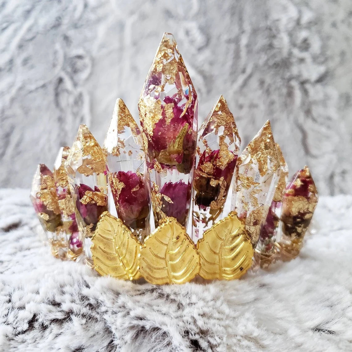 - Each tiara is a one of a kind due to the handcrafted nature of each resin crystal shape and the tumbled quartz crystal beads