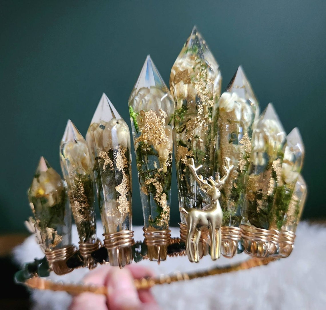 - Each tiara is a one of a kind due to the handcrafted nature of each resin crystal shape and the tumbled quartz crystal beads