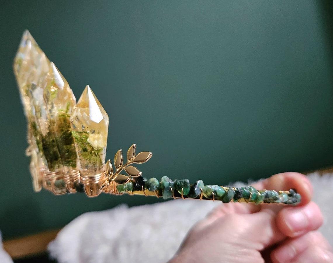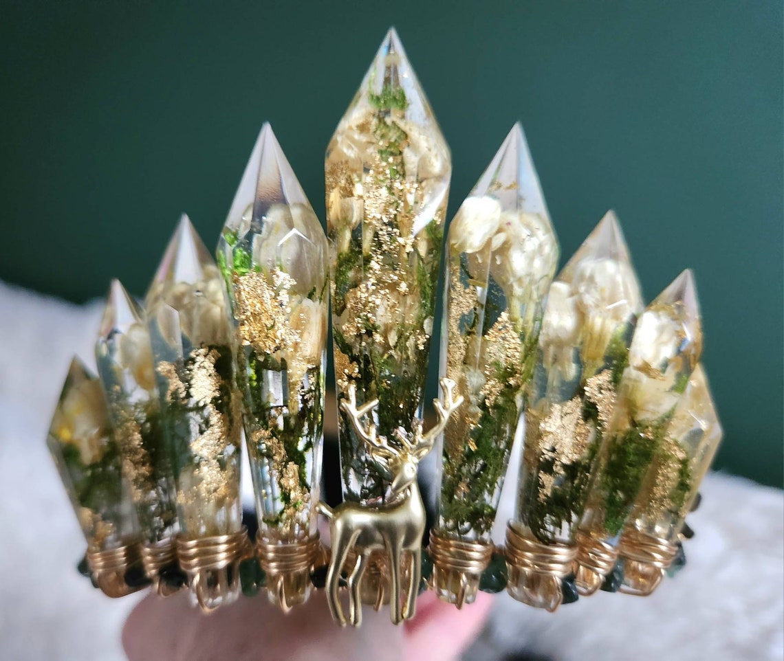Our Artemis goddess of the hunt headpiece is a design using "crystal" forms we've created using Epoxy resin that are carefully filled with a stunning blend of real dried Moss, Jasmine flower buds and faux gold flake. Surrounded by hand wire wrapped tumbled Emerald gemstones all atop a golden brass headpiece. Designed to sit atop the head like a tiara. Gently secure with Bobby pins if needed.