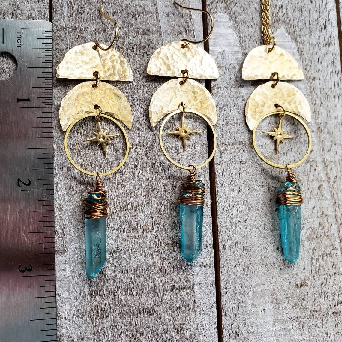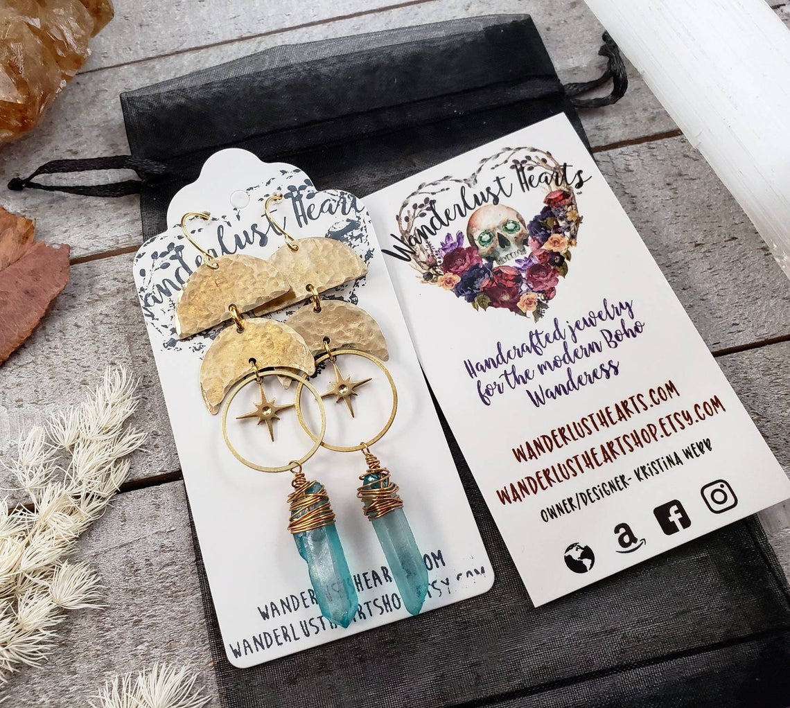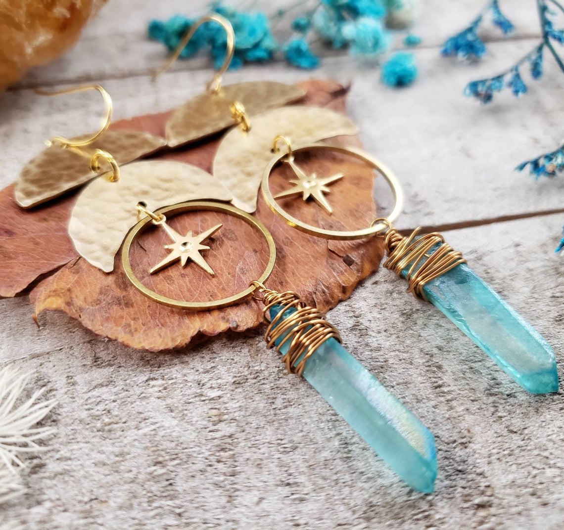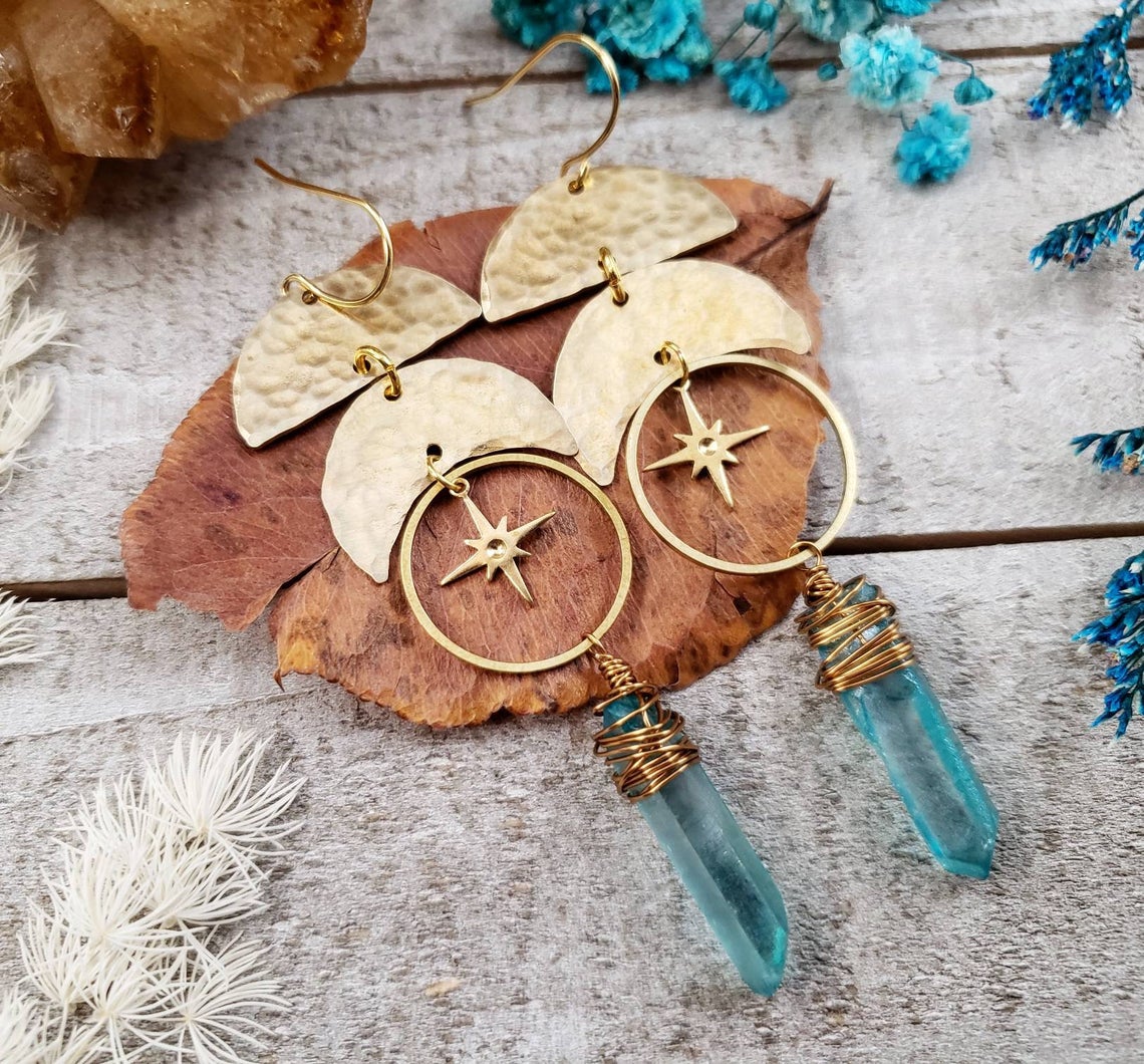 Introducing: The "Astraea" collectionThe Astraea features hammered metals, celestial elements and geometric shapes that form a gorgeous collection inspired by Greek goddess Astraea. Perfectly completed with vivid aqua quartz crystals.