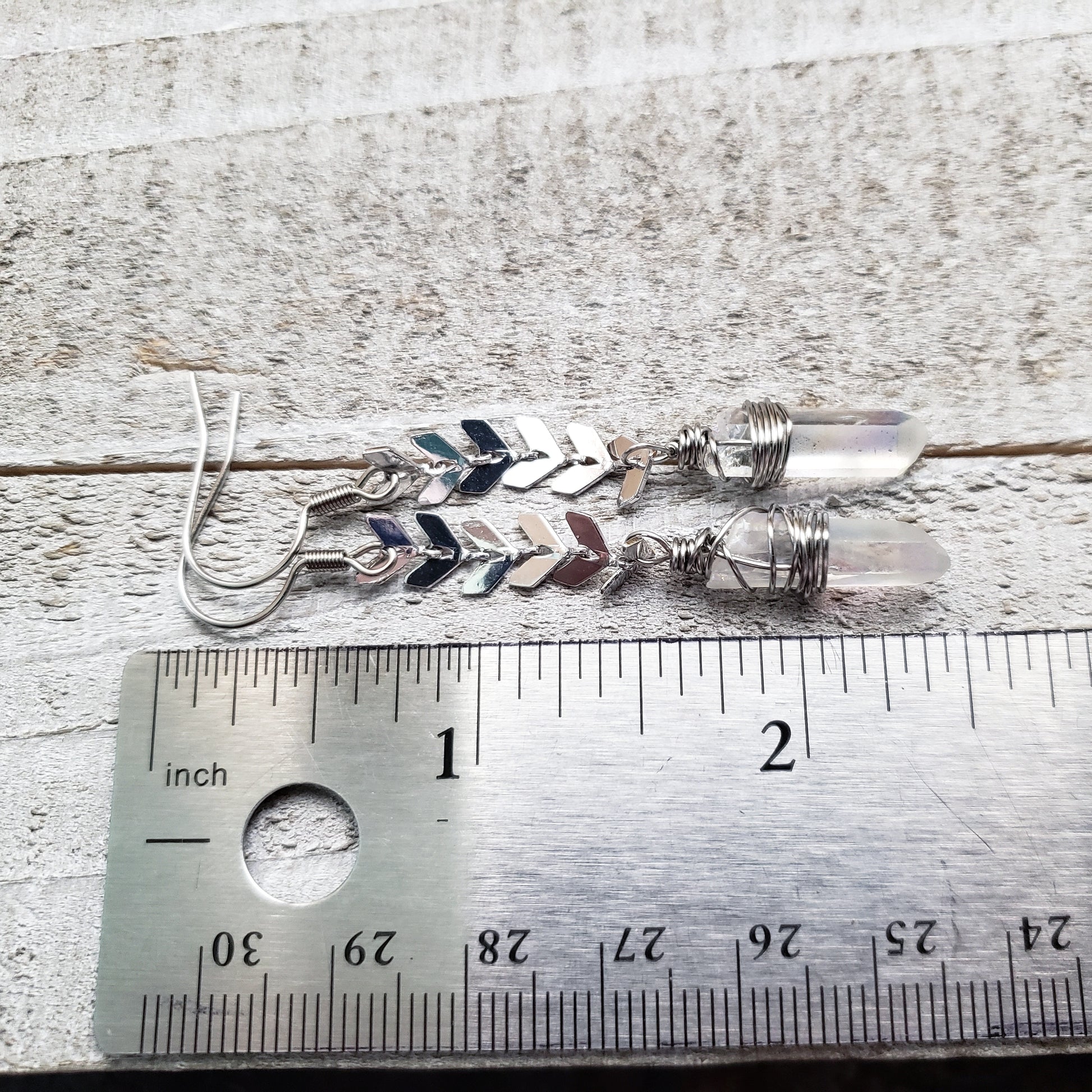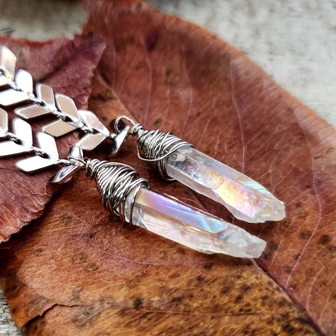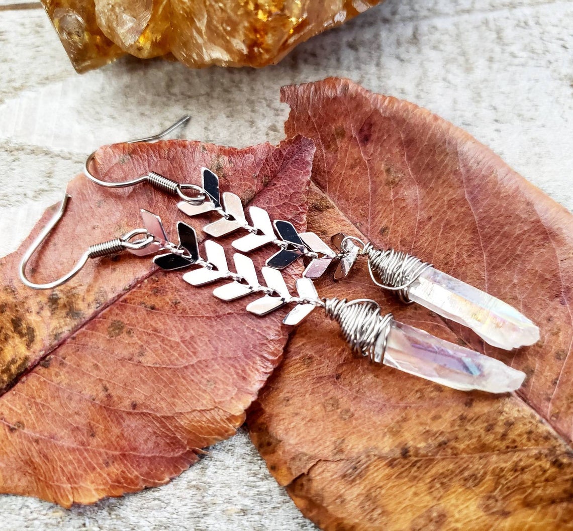 Sweet boho elegance. These quartz crystal earrings feature a solitaire drop of rose gold chevron that hold a single wrapped quartz crystal stick. So shimmery and sweet. You're definitely going to wear them all summer long!