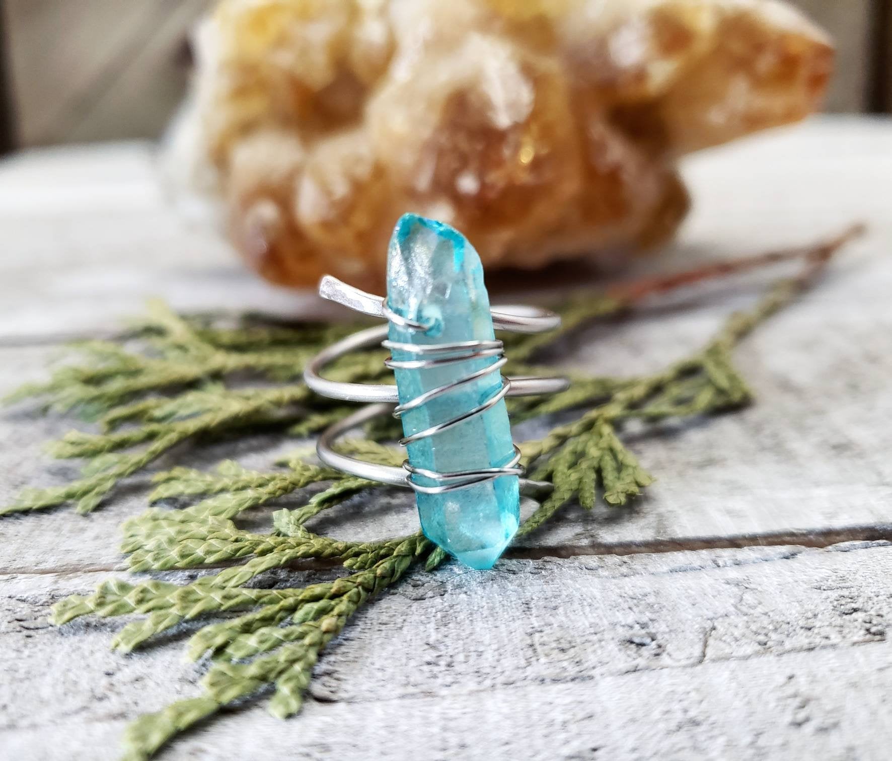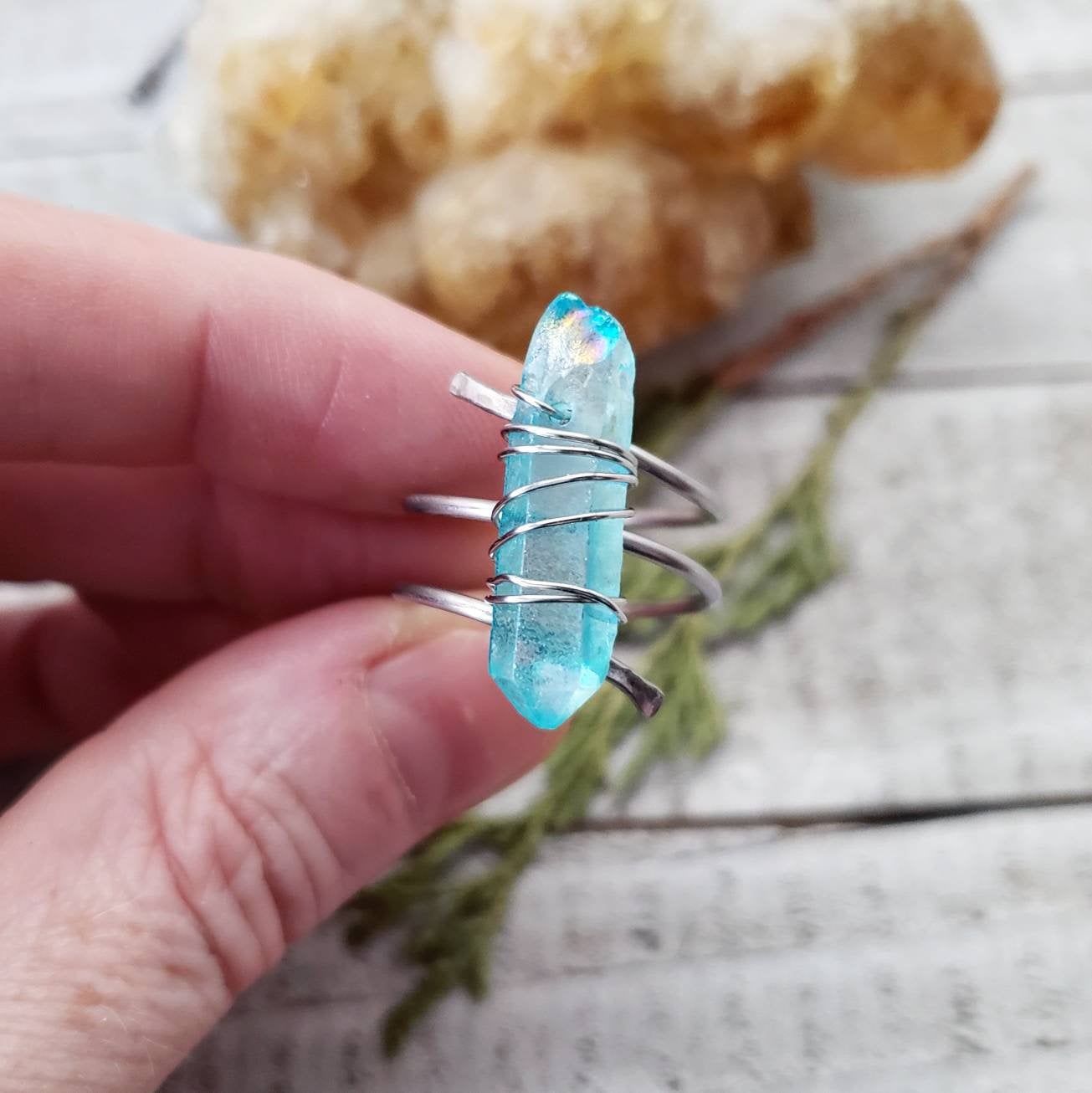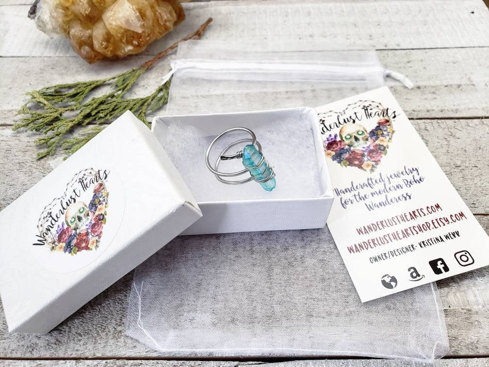 These gorgeous dainty boho rings are made with no tarnish stainless steel and a stunning aura quartz crystal stick securely wrapped with stainless wire. Make a statement with this boho silver twist ring.