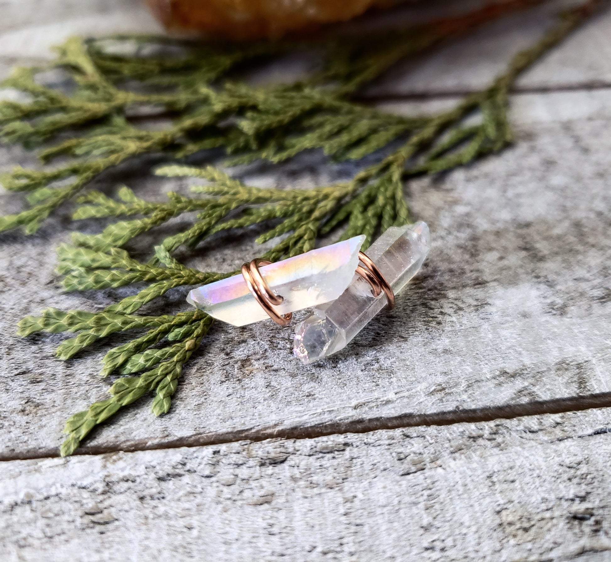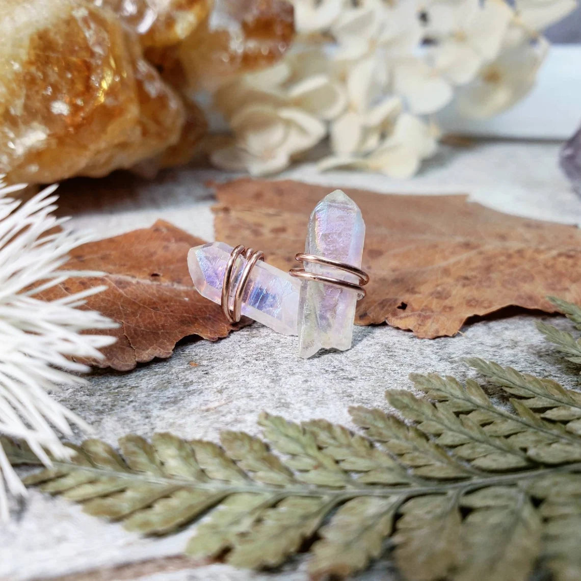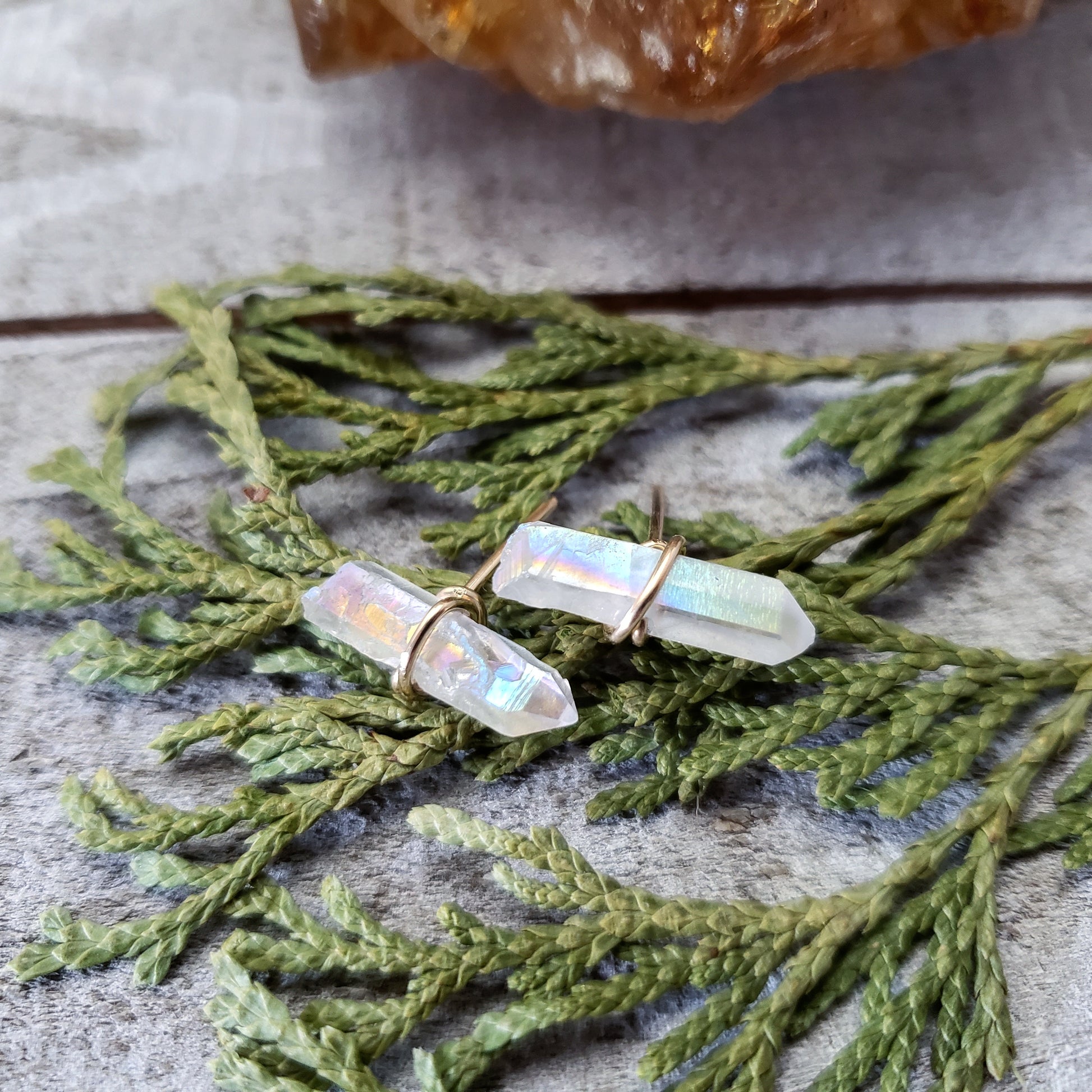 These aura quartz studs feature gorgeous little aura quartz crystals wrapped in your choice of .925 sterling silver, rose gold filled OR gold filled studs. These boho studs are perfect daily treat for your ears.