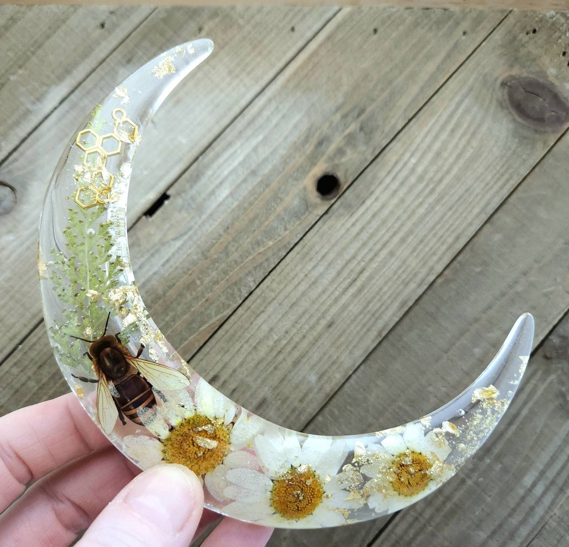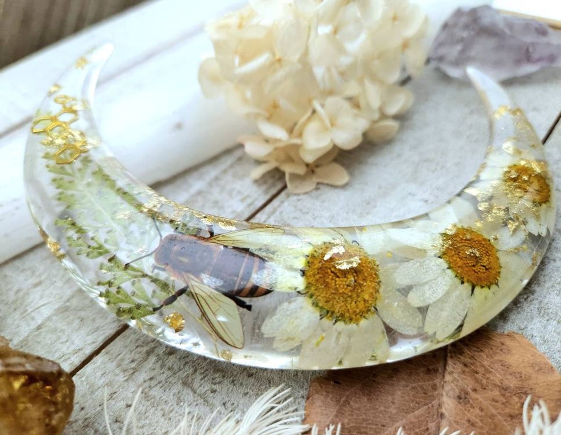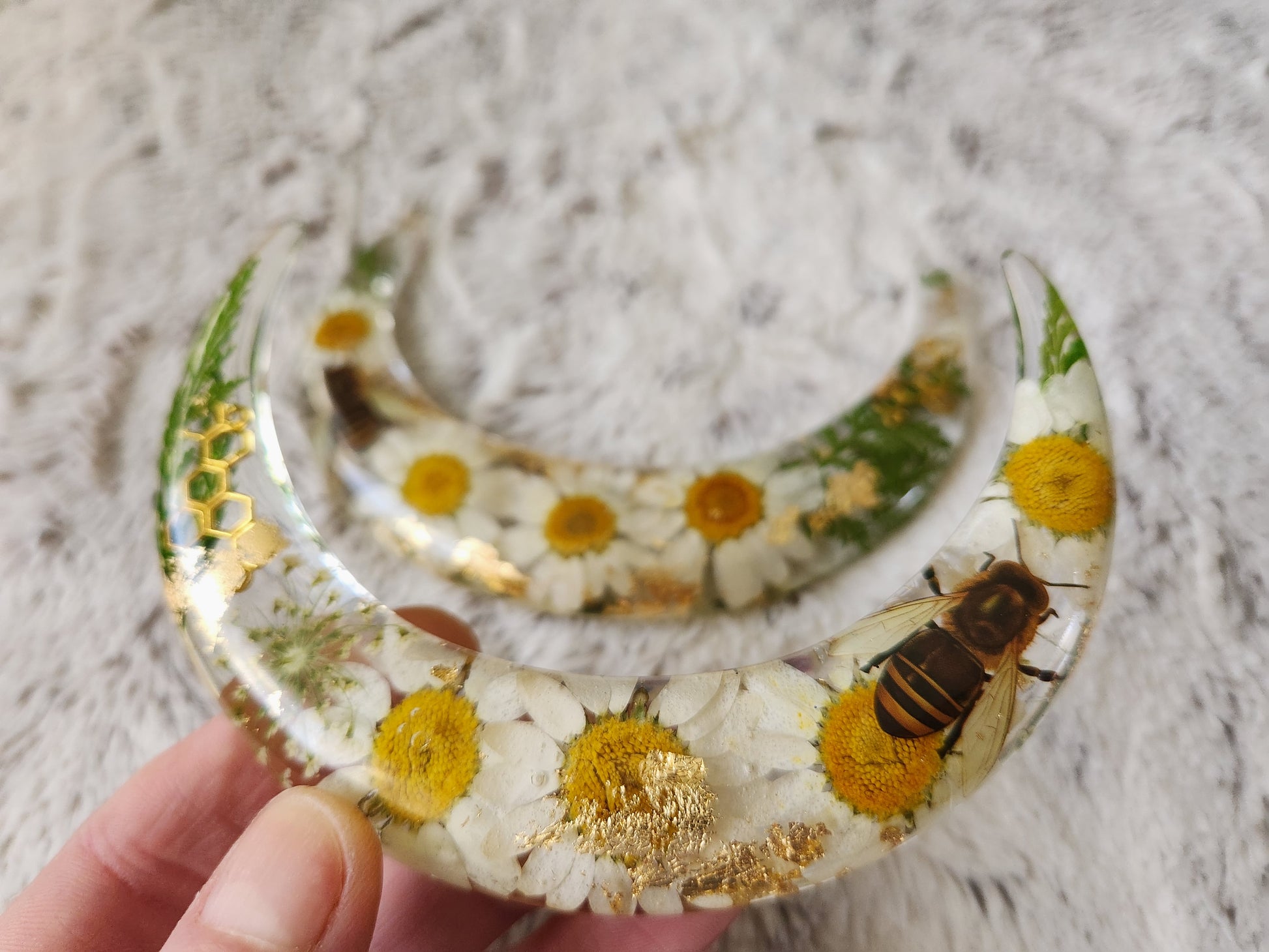 Our new floral moon hair fork is a gorgeous pop of woodland style. Real dried daisy flowers , gold flake and a golden honey comb are sealed within a celestial crescent moon hair fork. Don't worry that sweet little honey bee is just film carefully set in the resin.