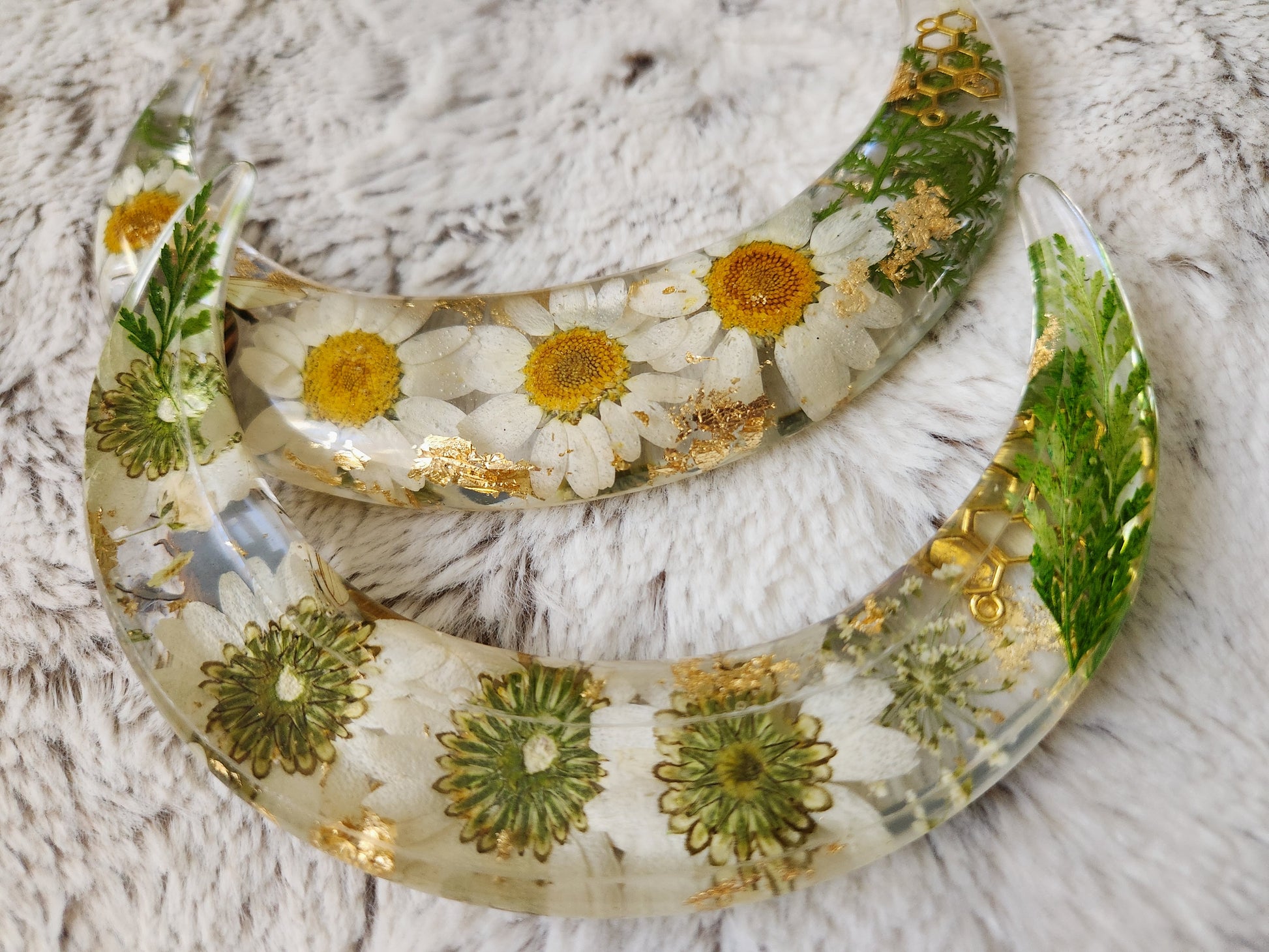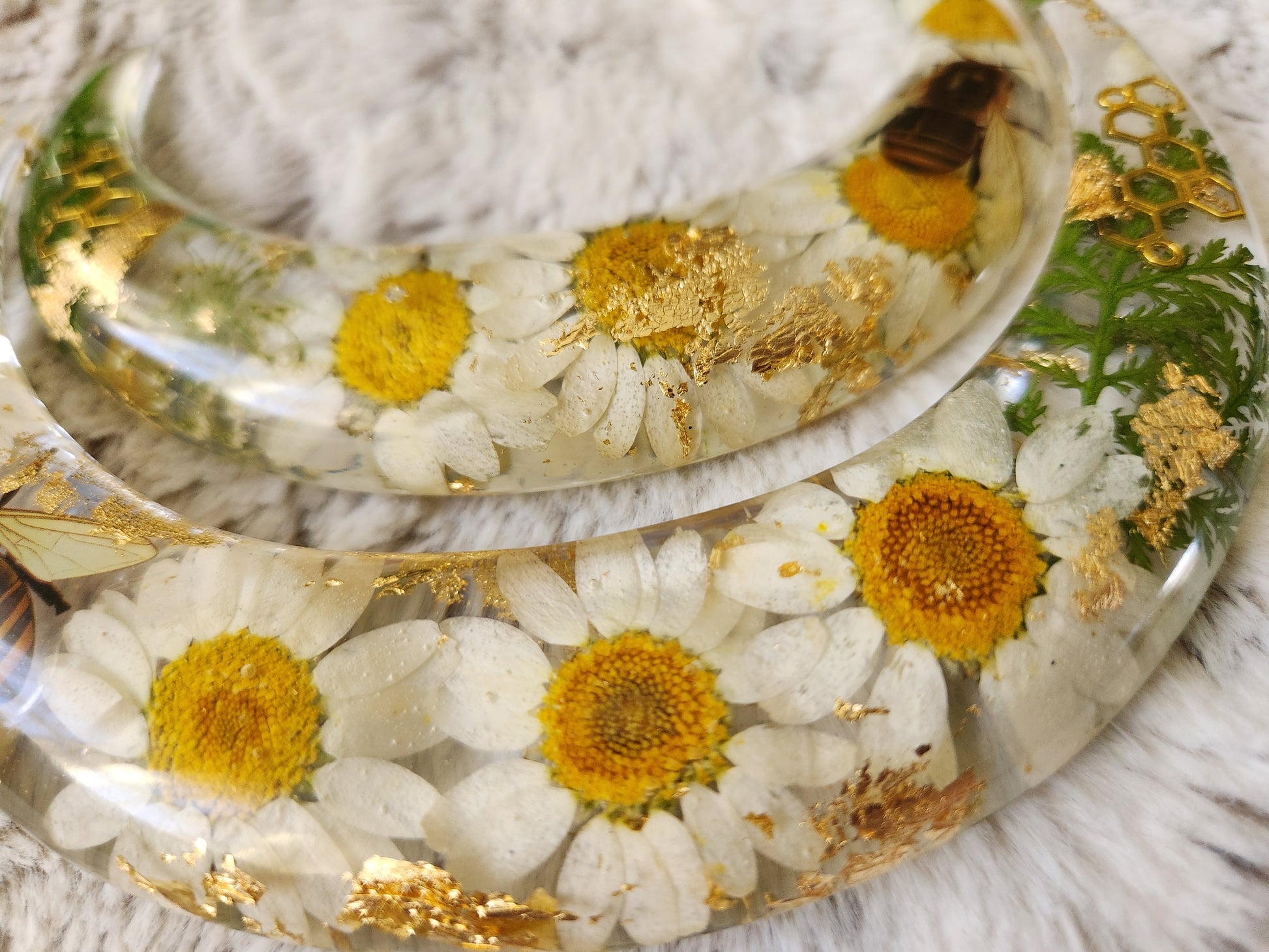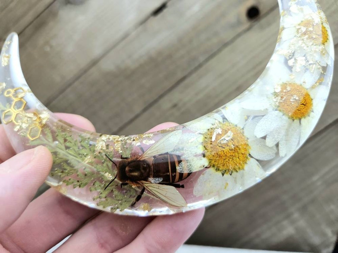 Our new floral moon hair fork is a gorgeous pop of woodland style. Real dried daisy flowers , gold flake and a golden honey comb are sealed within a celestial crescent moon hair fork. Don't worry that sweet little honey bee is just film carefully set in the resin.