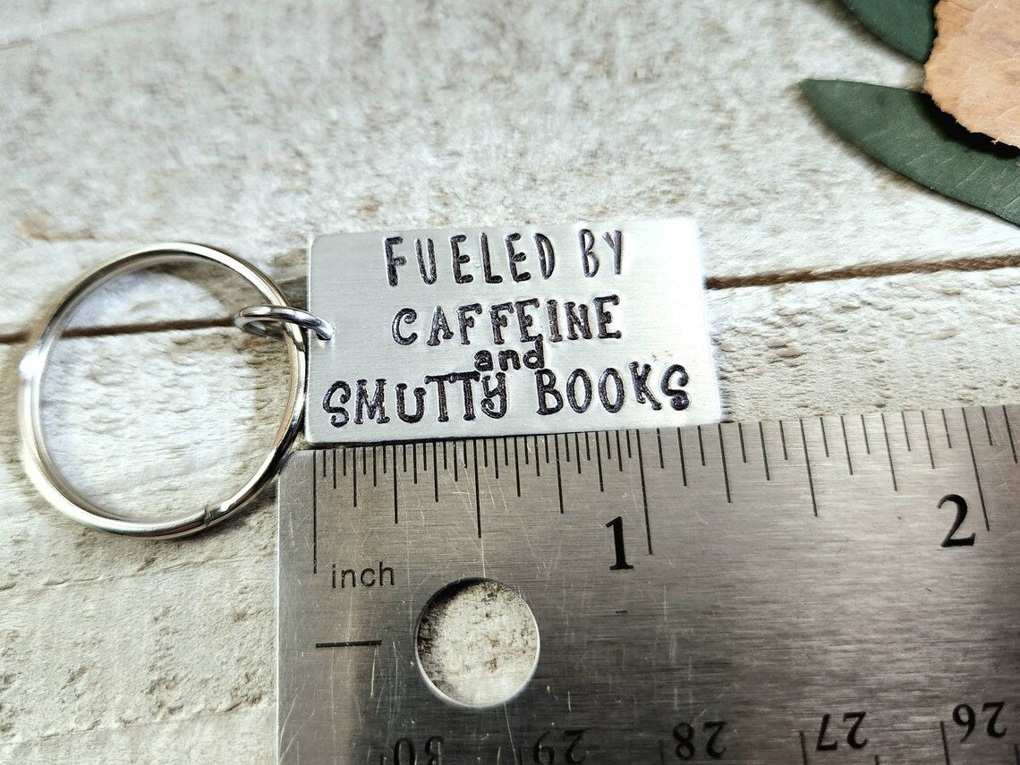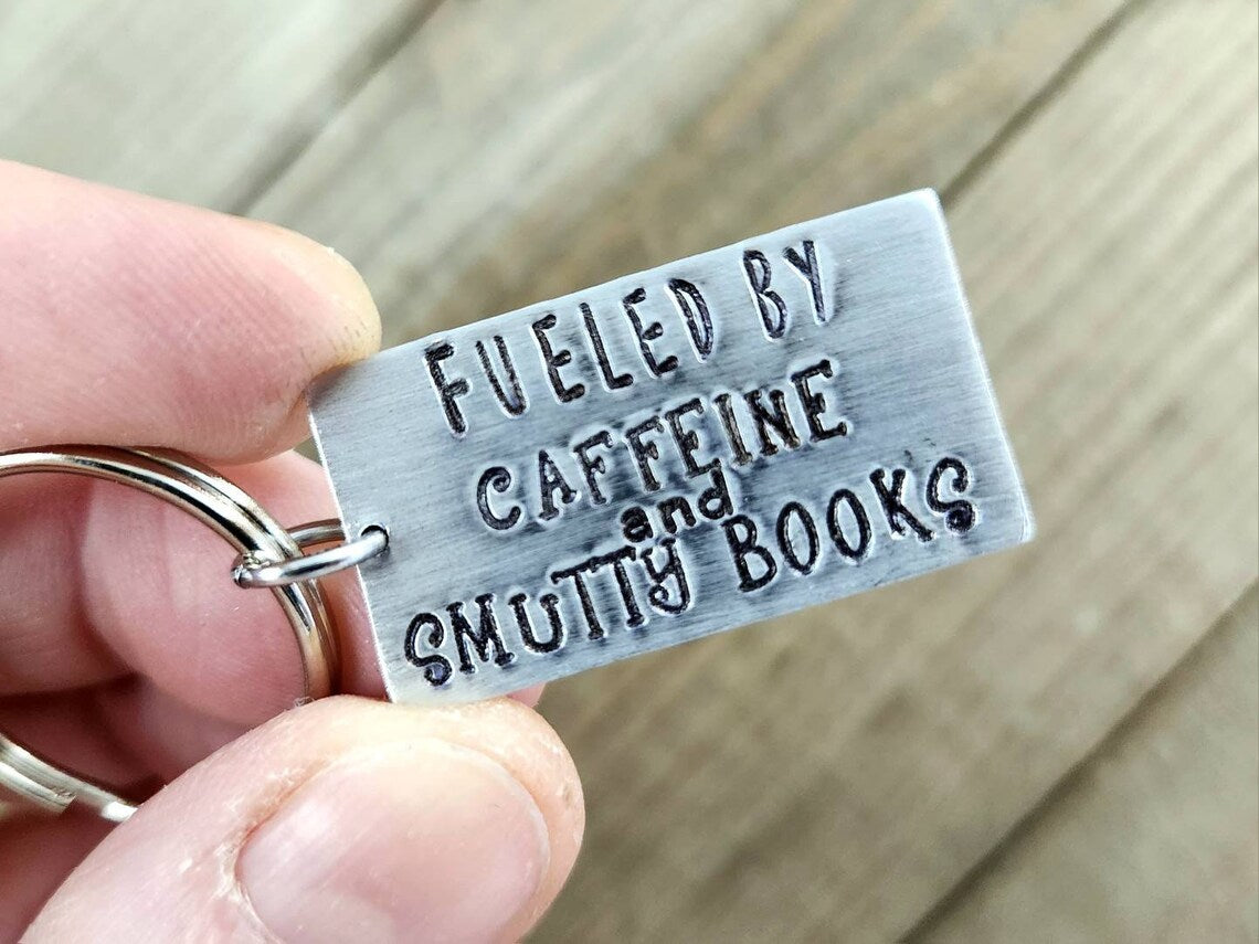Fueled by caffeine and smutty books. Is there any other way to live? Our stamped keychains make a great gift for those who enjoy reading smutty books and have no shame about it โค๏ธ ( we love them too ๐)