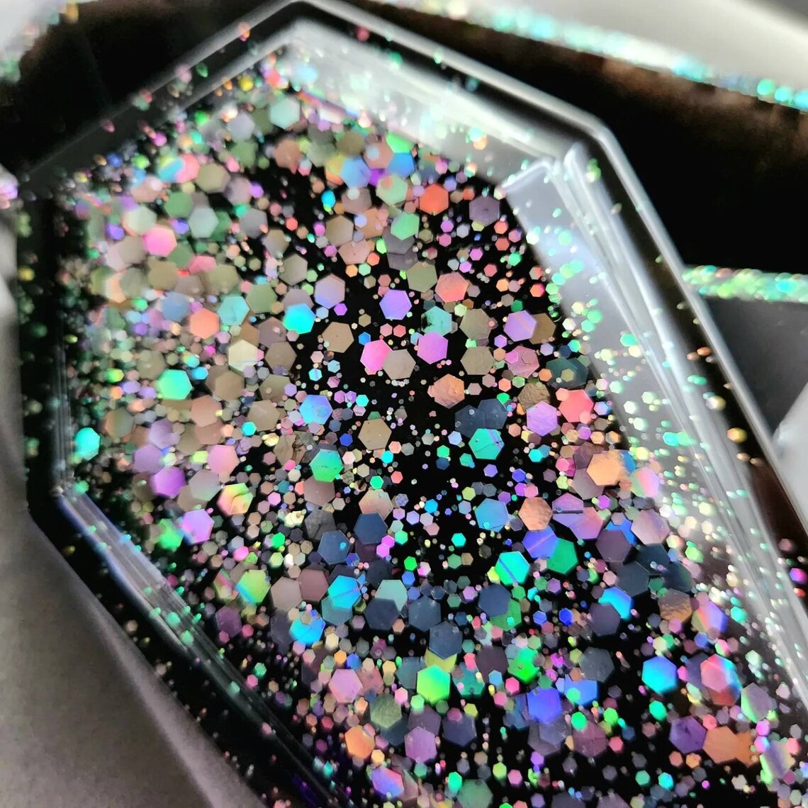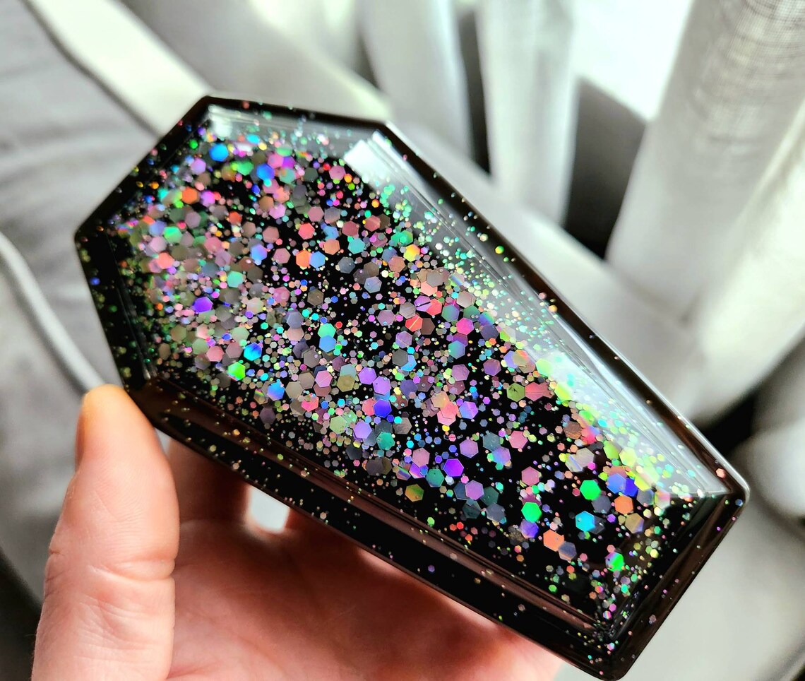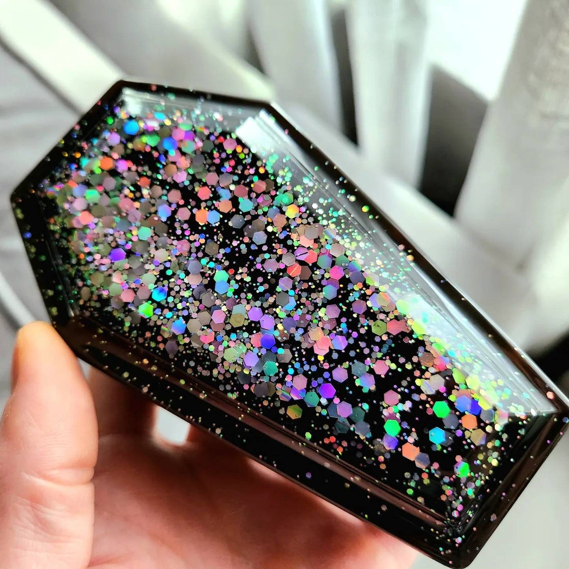 Our witchy goth coffin trinket box is so spooky and beautifully sparkly. Handcrafted with epoxy resin and our own blend of dyes and glitters, this jewelry box is a perfect accent to your spooky home decor. Makes a great storage container for jewelry, keys, herb,and more!