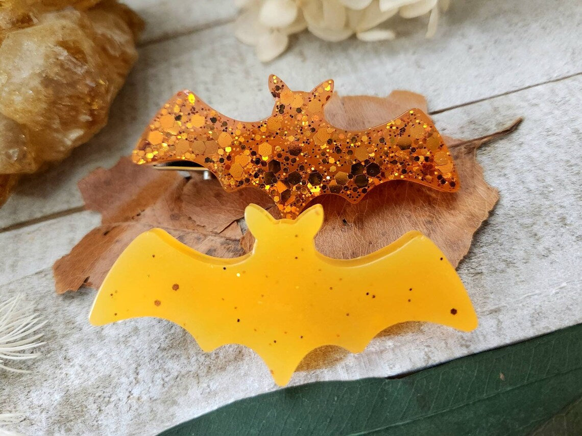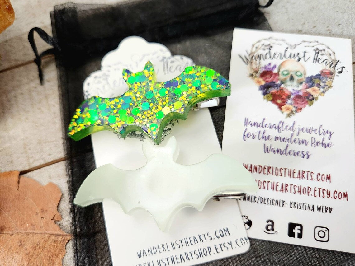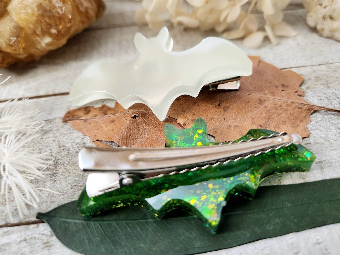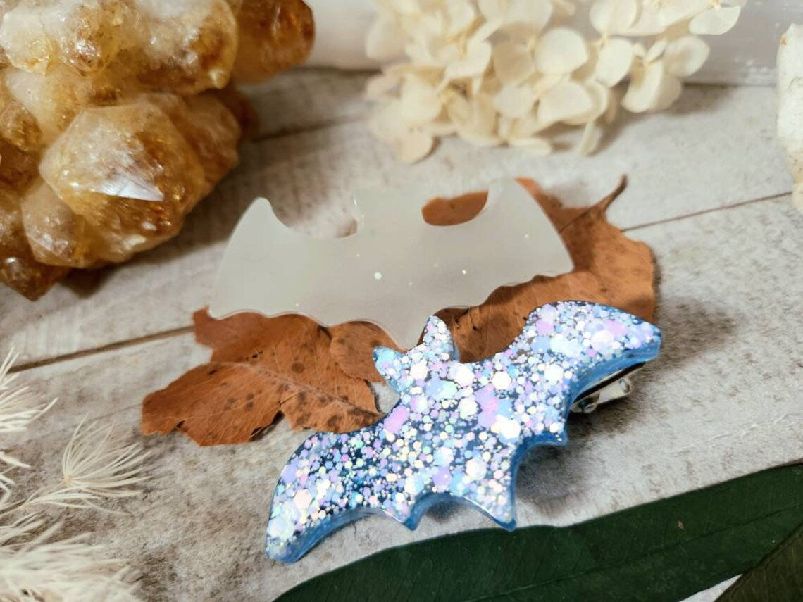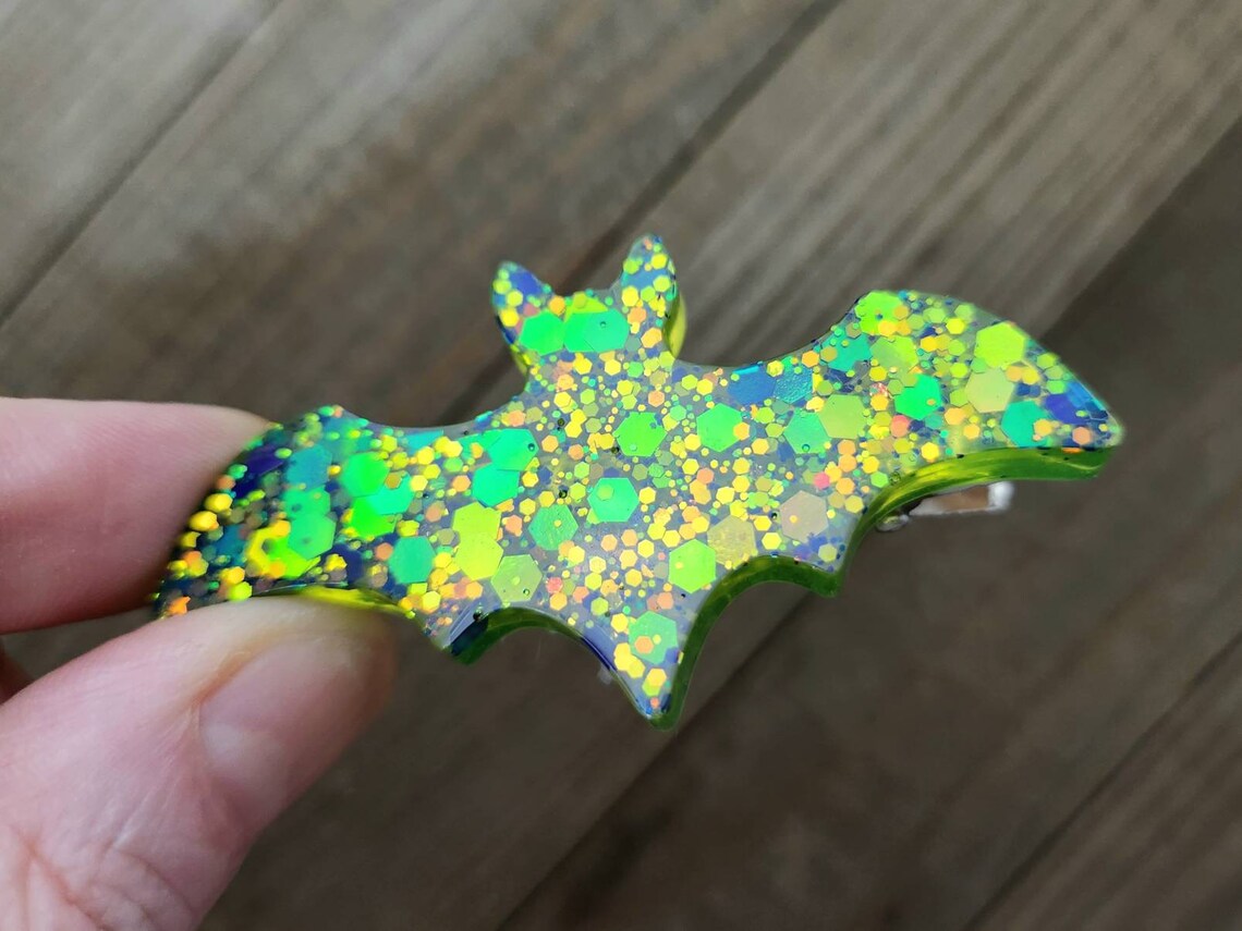 Our Bat hair clips are sure to make a glittery statement for any age! Our 2 piece mis-matched set is created using Epoxy resin and a gorgeous combination of color and glitter that color shifts when you see at it on an angle.