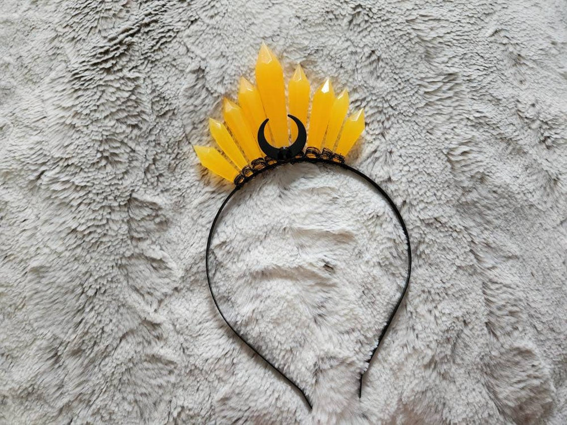 Glow queen! Our goth glow in the dark tiara looks super cute upon your spooky head for Halloween and after.... ๐ป Our resin " crystal forms" have been given a heavy dose of glow pigment to make you shine above the rest. Hand wrapped onto a black headband base and given a celestial horn moon finish. ๐