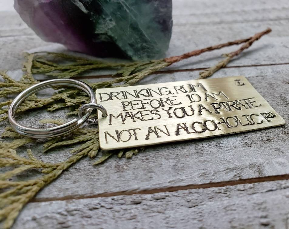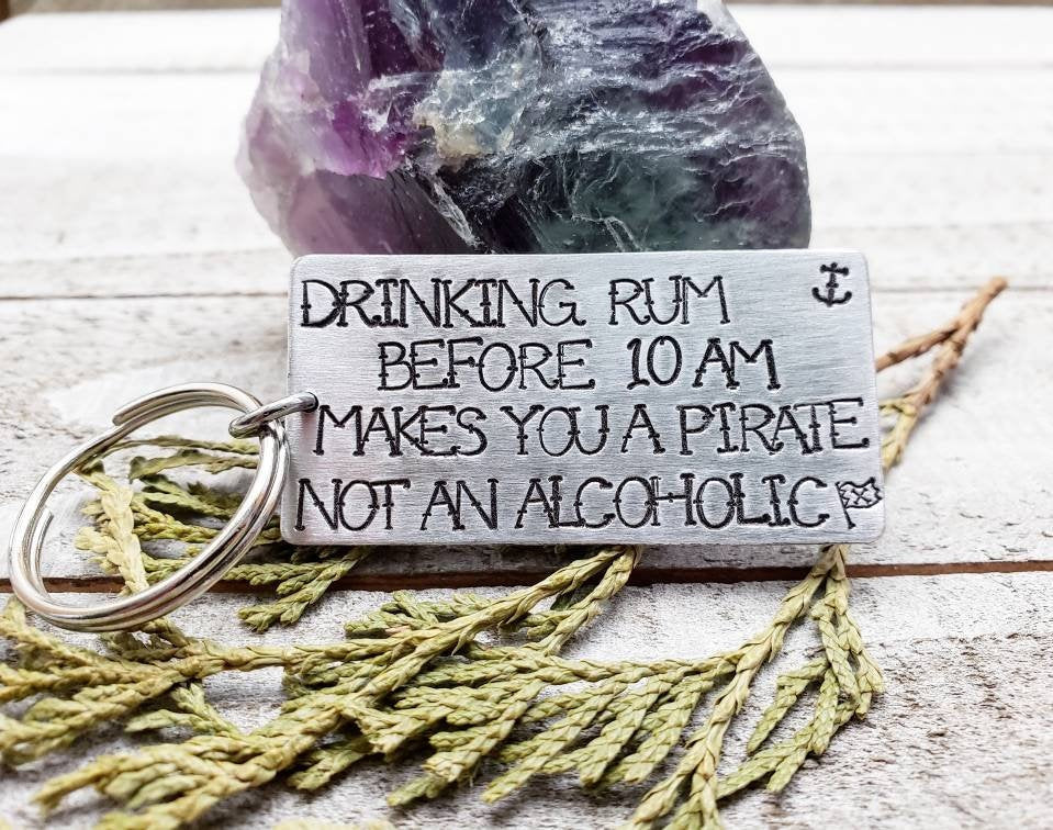 - "Drinking rum before 10am makes me a pirate not an alcoholic" hand stamped phrase- 2"inch stamped keychain