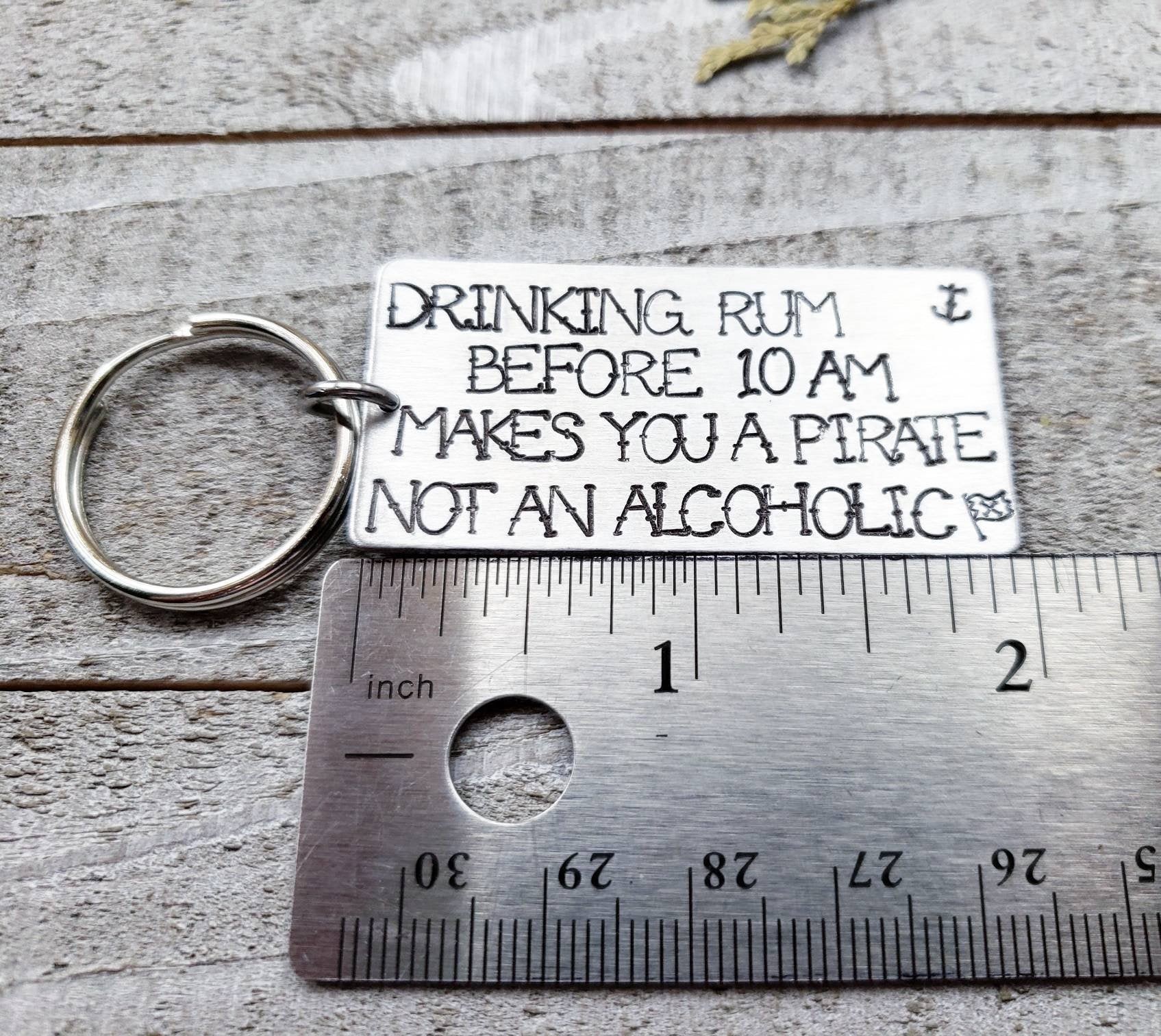 Drinking rum before 10am makes me a pirate - not an alcoholic stamped keychain is a funny gift idea!Β Hand stamped silver aluminum keychain comes with an attached 1" inch stainless steel split ring.