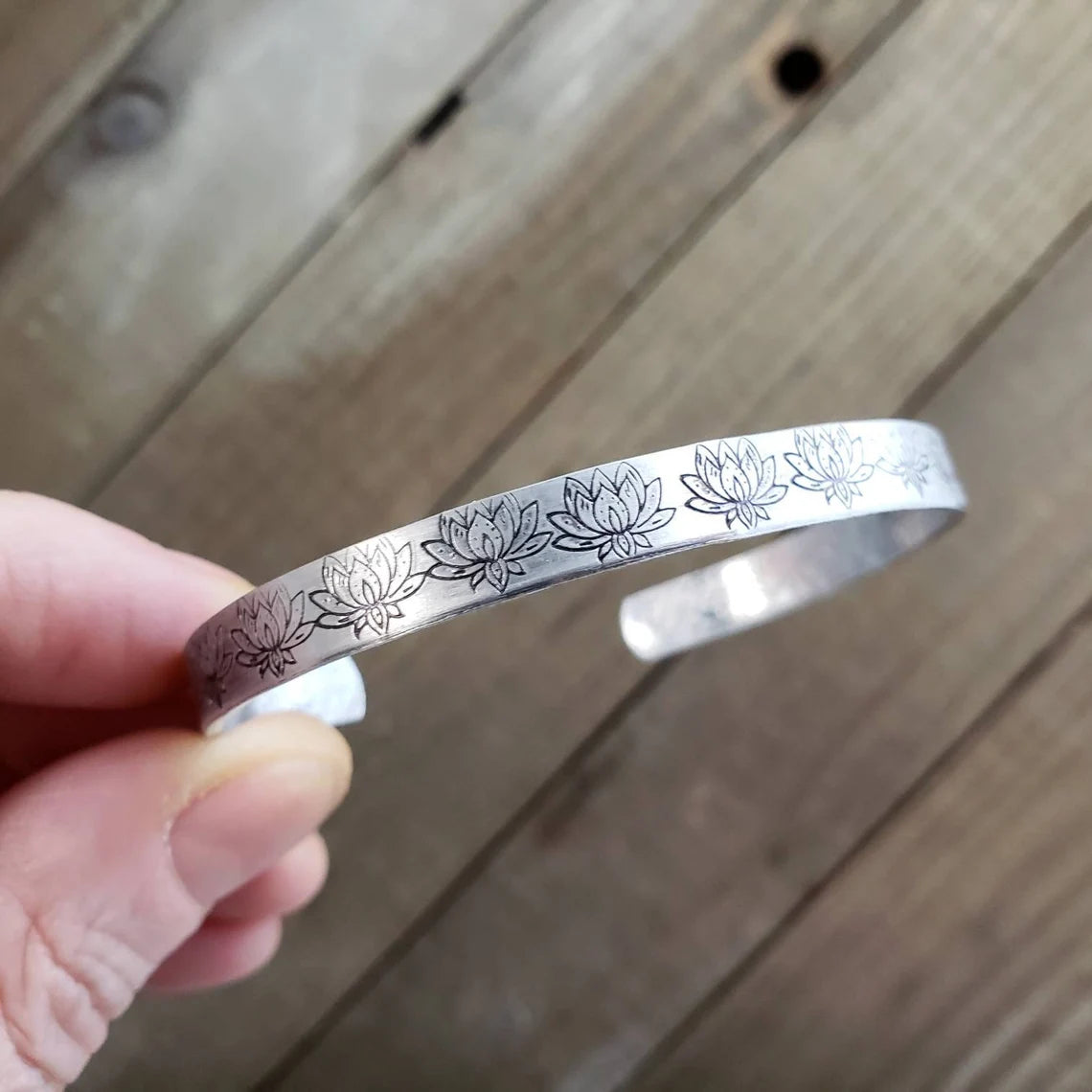A perfect everyday cuff bracelet. An entrancing pattern of fancy lotus flowers stamped onto a thin silver cuff. Makes a great yoga gift!