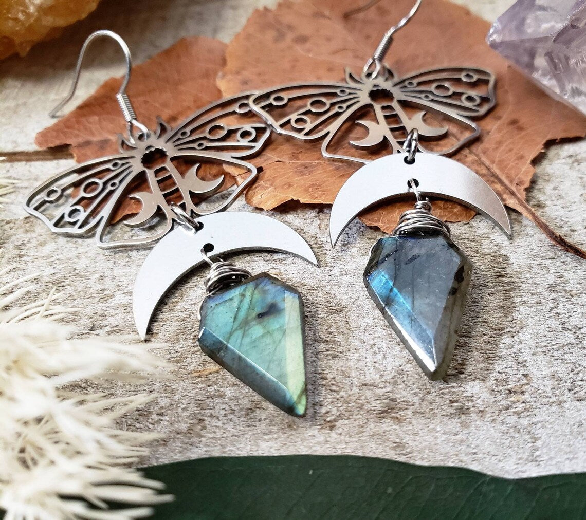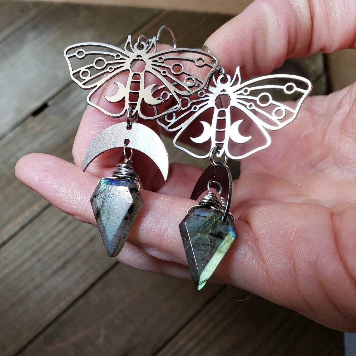 Behold, our entrancing new luna moth earrings featuring a stack of stainless steel no tarnish celestial moth moon phase charm perfectly finished with a Labradorite gemstone dagger. Our celestial geometric earrings are made completely of stainless steel tarnish free materials for long lasting shine.