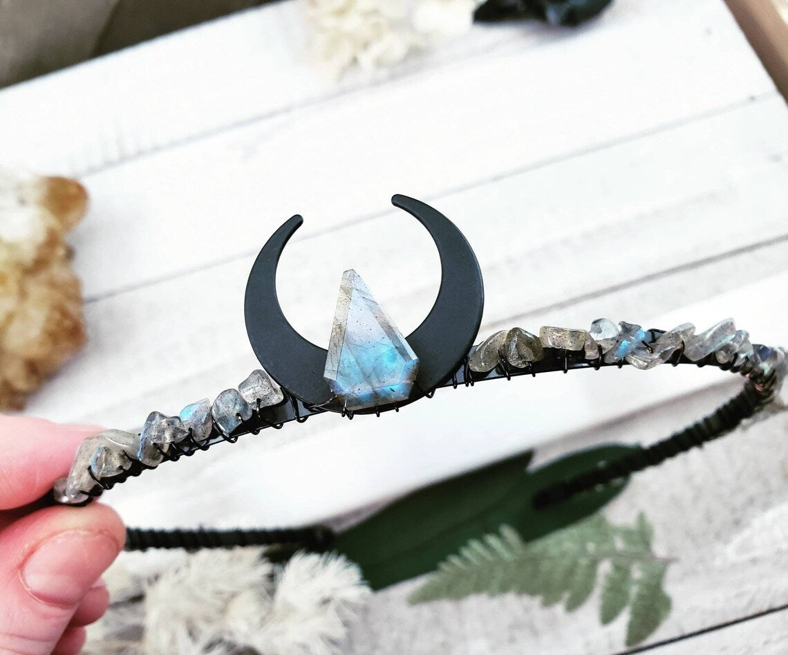 Our Nyx night goddess headpiece is a goth style stunner with super flashy hand beaded labradorite gemstones all around the headpiece. The centerpiece features an incredible AAA Quality Labradorite dagger that is faceted and polished to perfection. Our goth moon crown is perfect for goth weddings, festivals and more!
