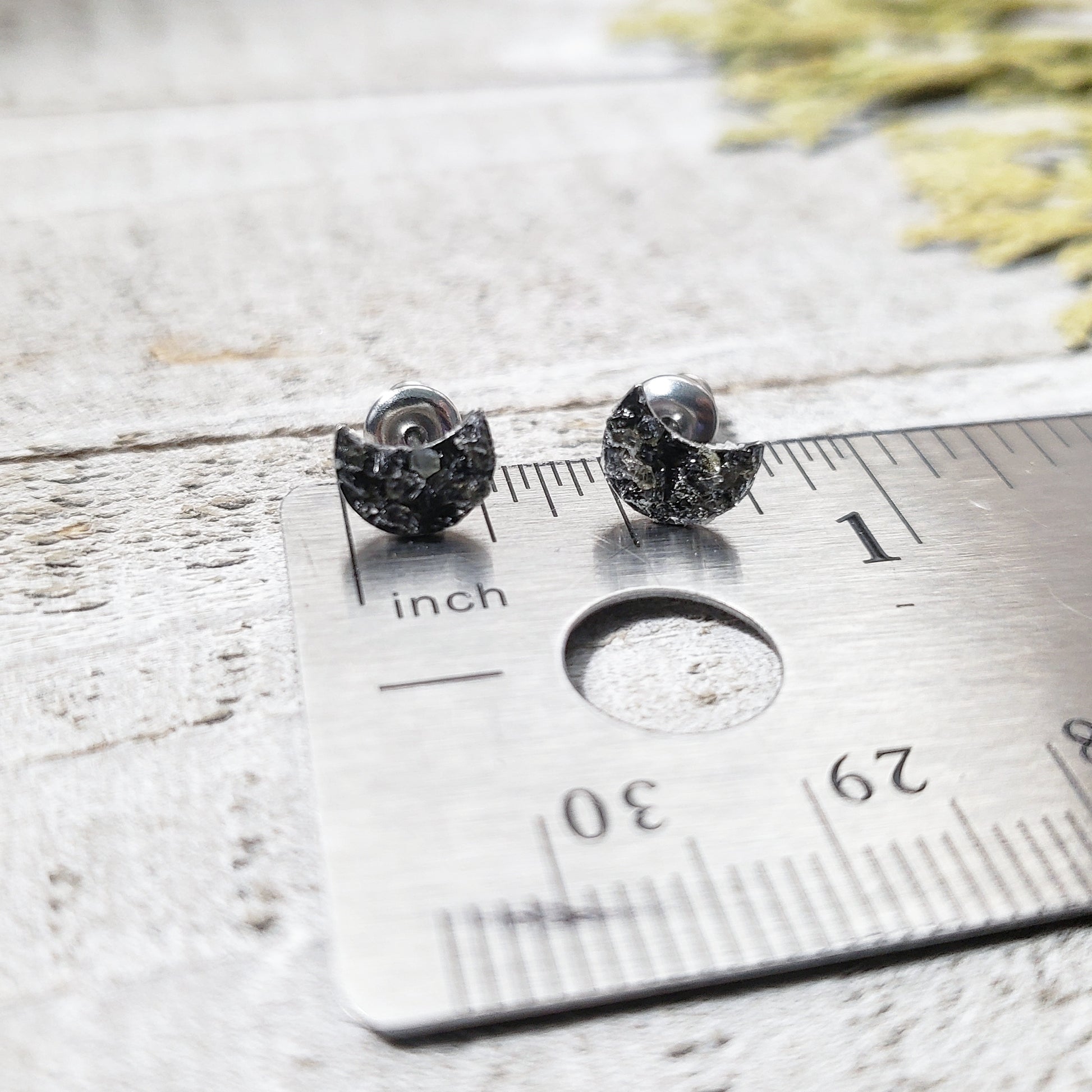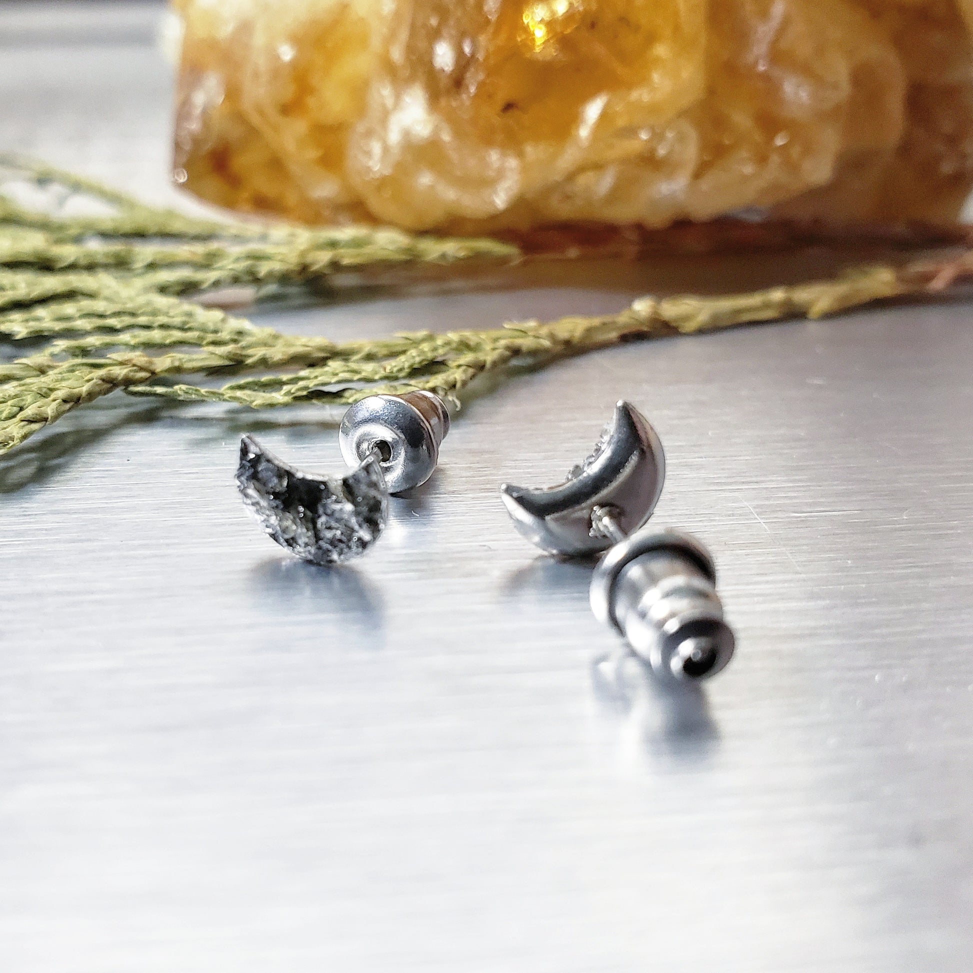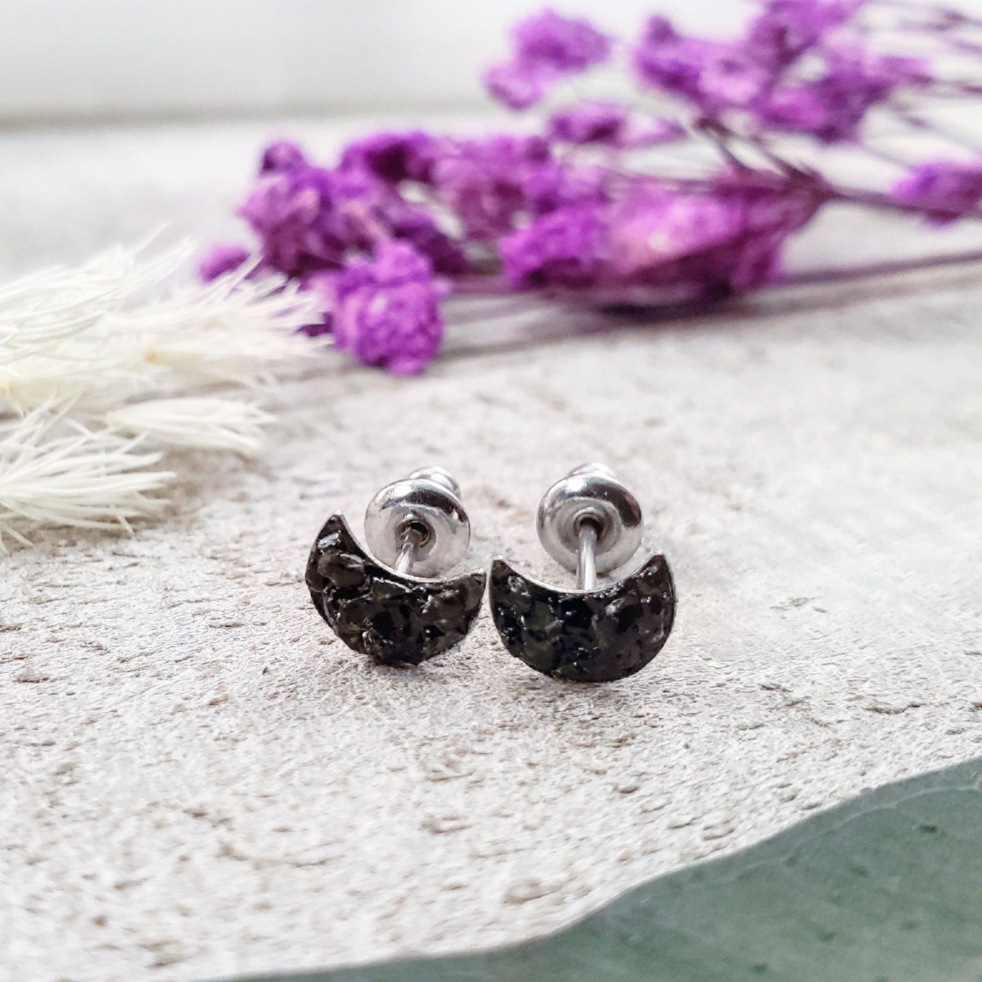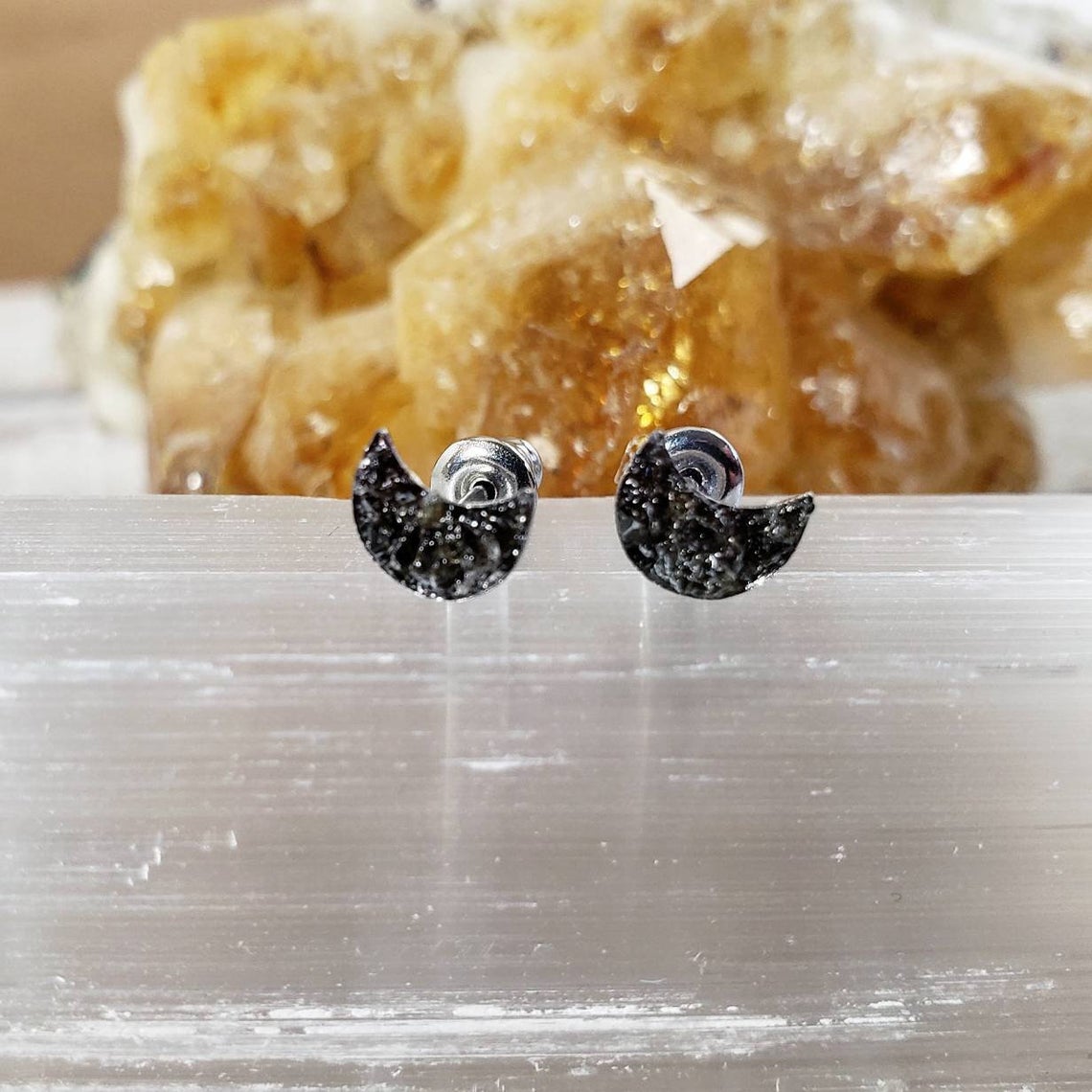 Invoke your mysterious side with these crescent moon stud earrings. Dainty moon studs are encrusted with crushed obsidian gemstone.