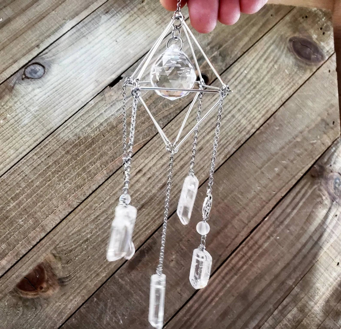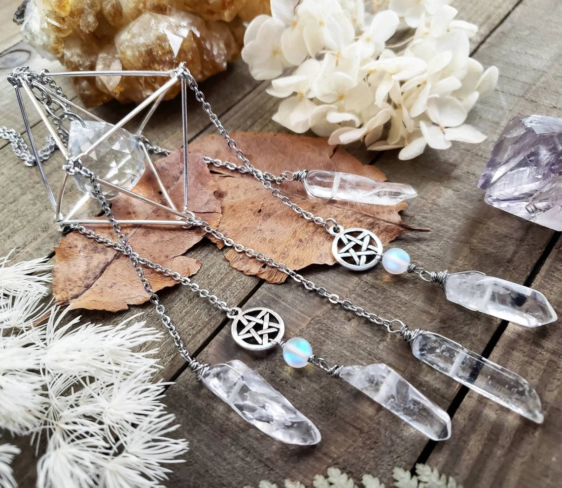 Our newest prism sun catcher is a boho witchy home decor treat! Silver links create a pendulum prism we have adorned with a faceted sun-catching crystal within it. Dangling from beneath we added clear quartz crystal filled with positive energy, dainty silver pentacles and mermaid glass beads that throw amazing rainbow sheen from them.
