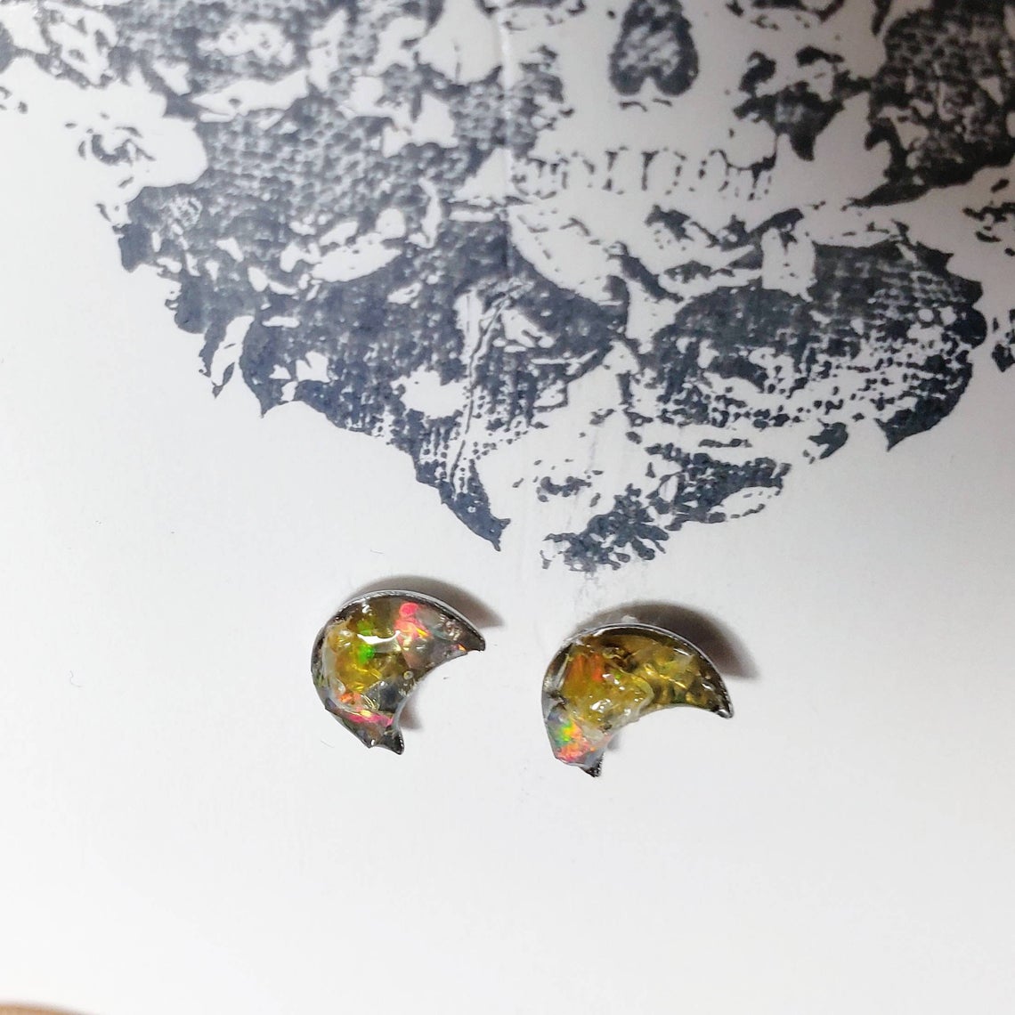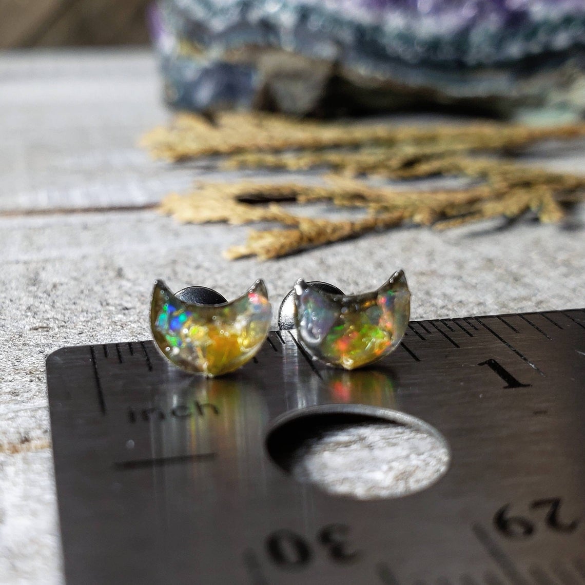 These gorgeous little moon stud earrings are encrusted with rough raw Ethiopian welo opal chips. Perfect for gifting because they're crafted with stainless steel hypoallergenic stud earrings. Gorgeous flashes of color at each angle. Each pair is a one of a kind!