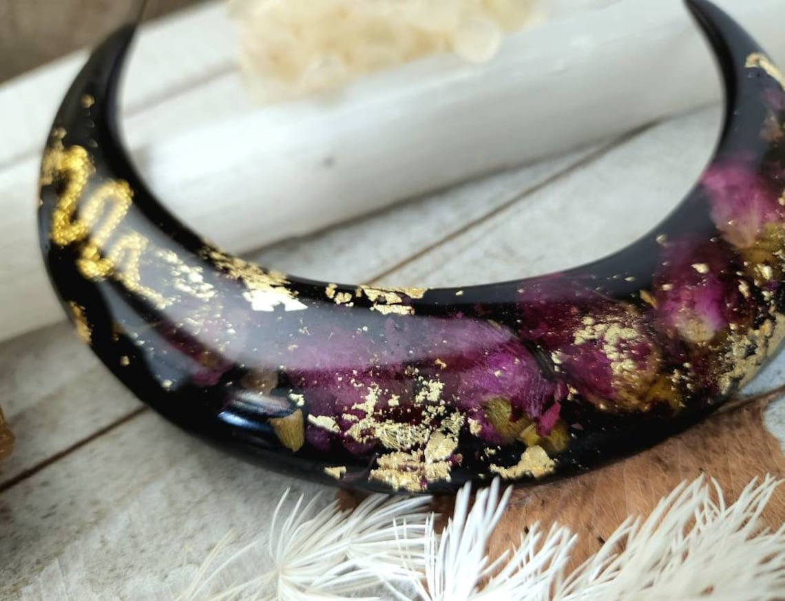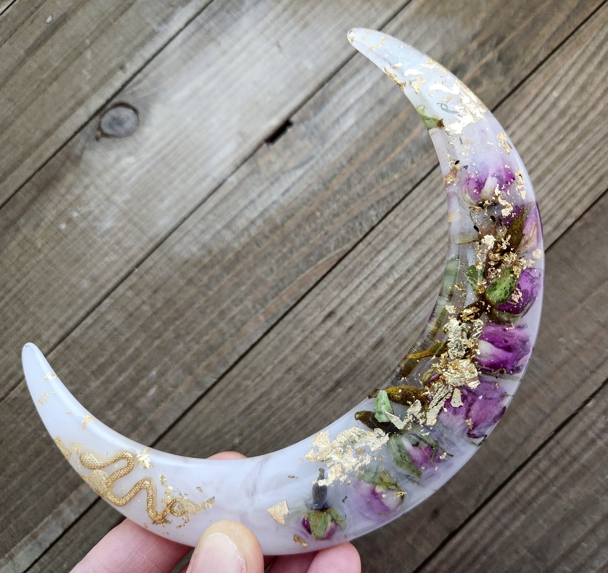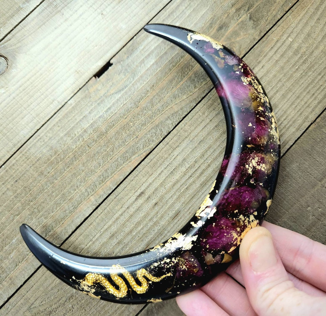 Our new Greek goddess floral moon hair pick is a gorgeous colorful pop of boho style for your spring style. Real dried rose buds , gold flake and a golden snake serpent charm are sealed within a crescent moon hair fork.