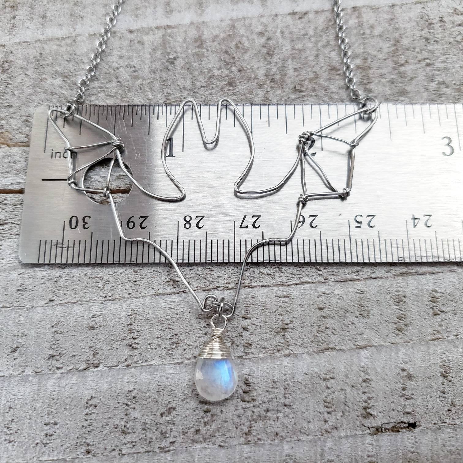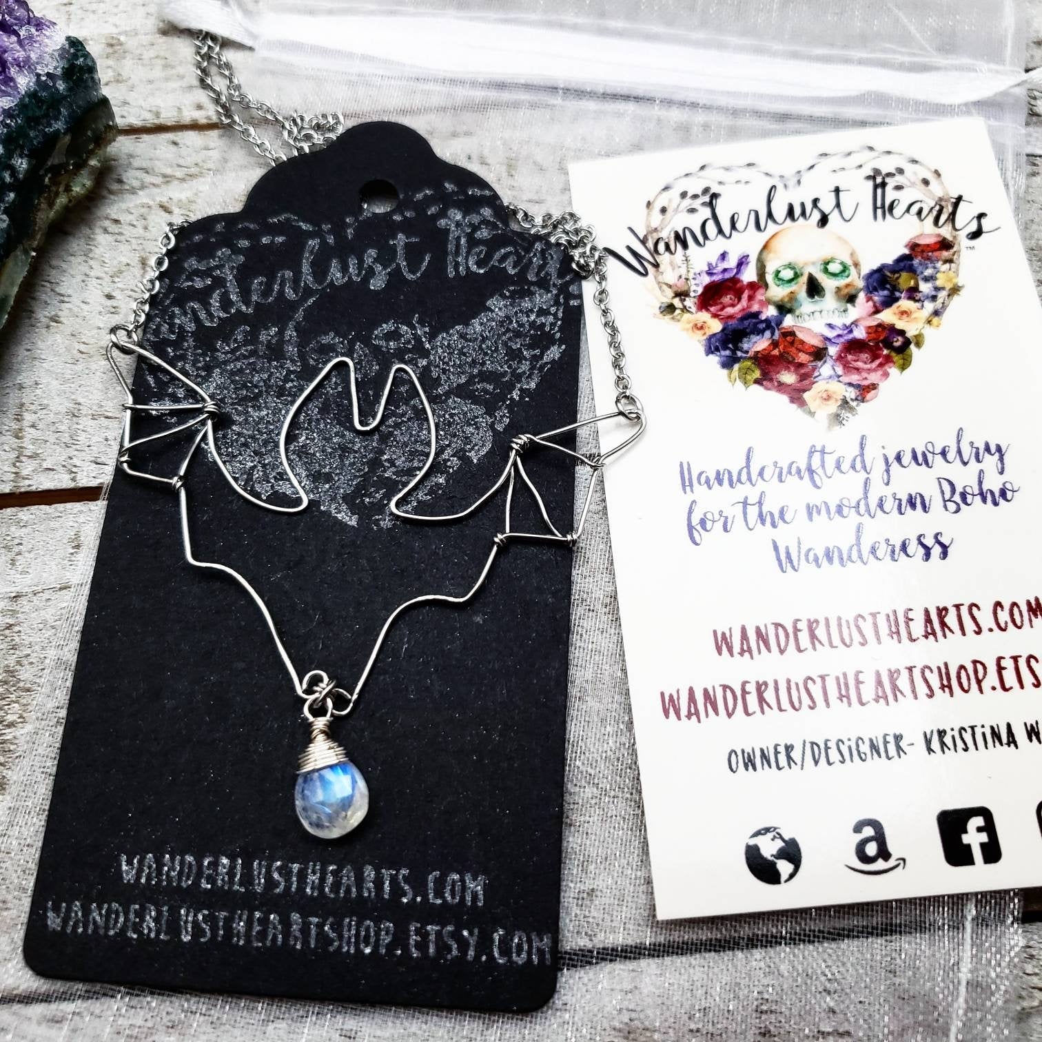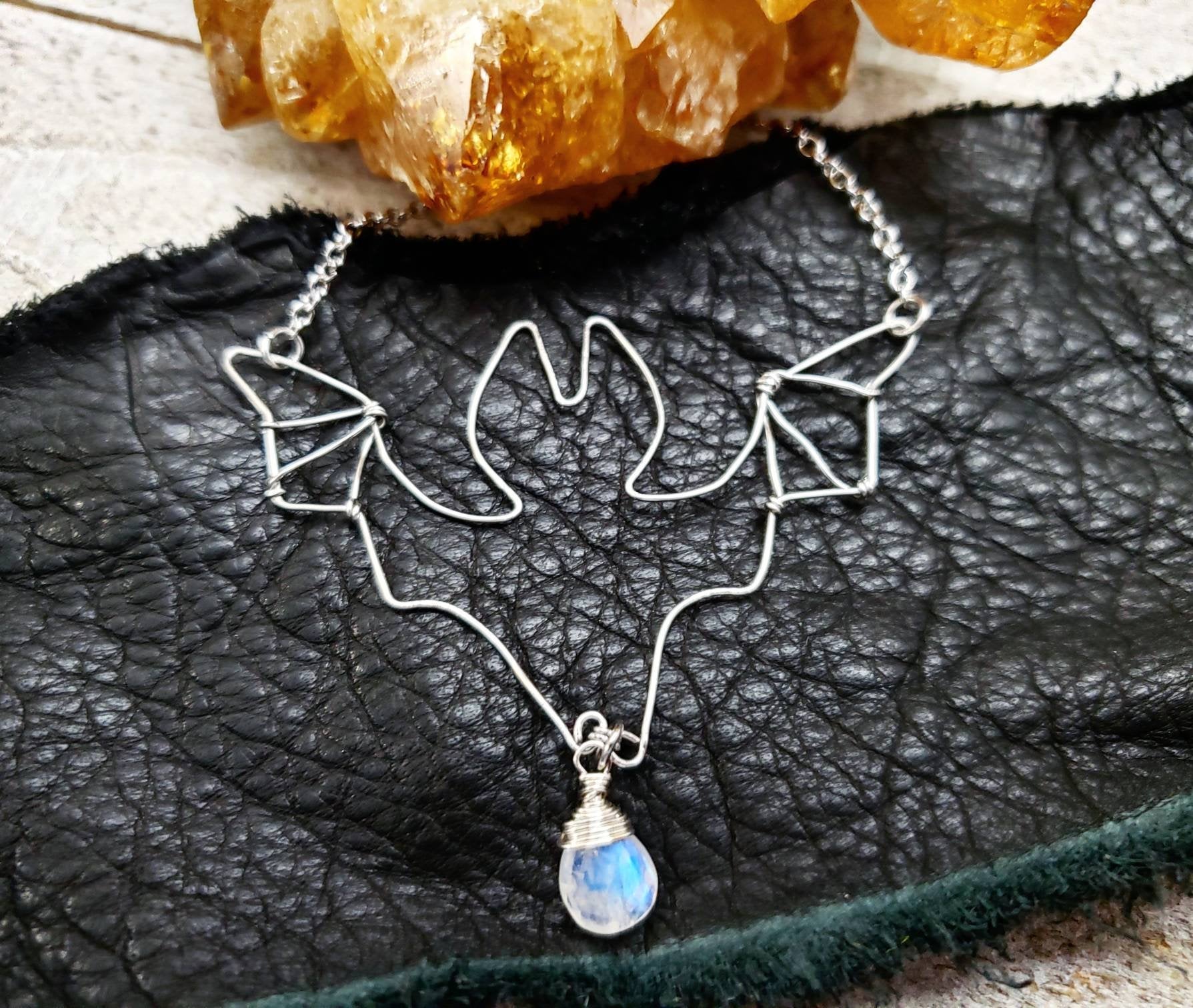 These adorable baby bat necklaces are handcrafted with stainless steel wire for long lasting never tarnish Halloween style. Measuring roughly 2 inches wide, each silver bat pendant holds a solitaire one of a kind rainbow moonstone drop.