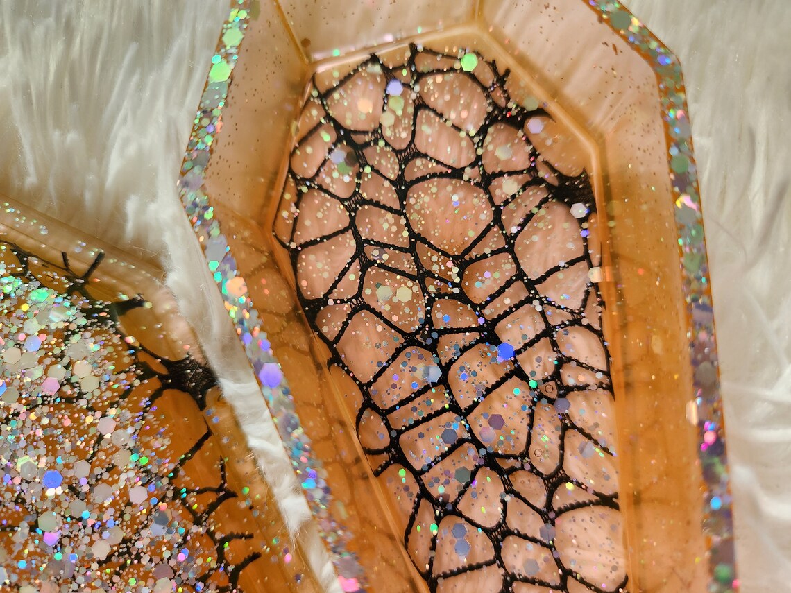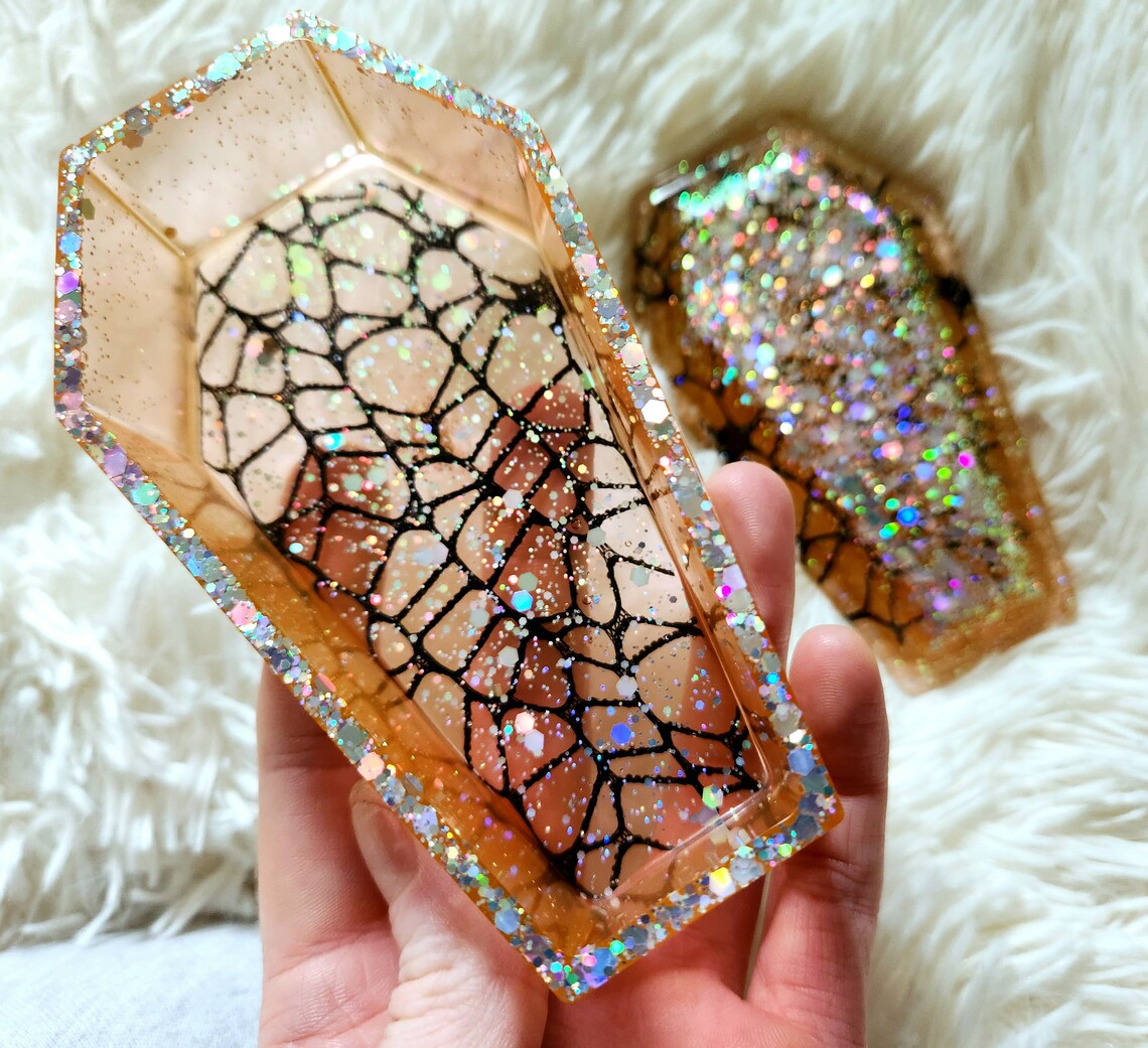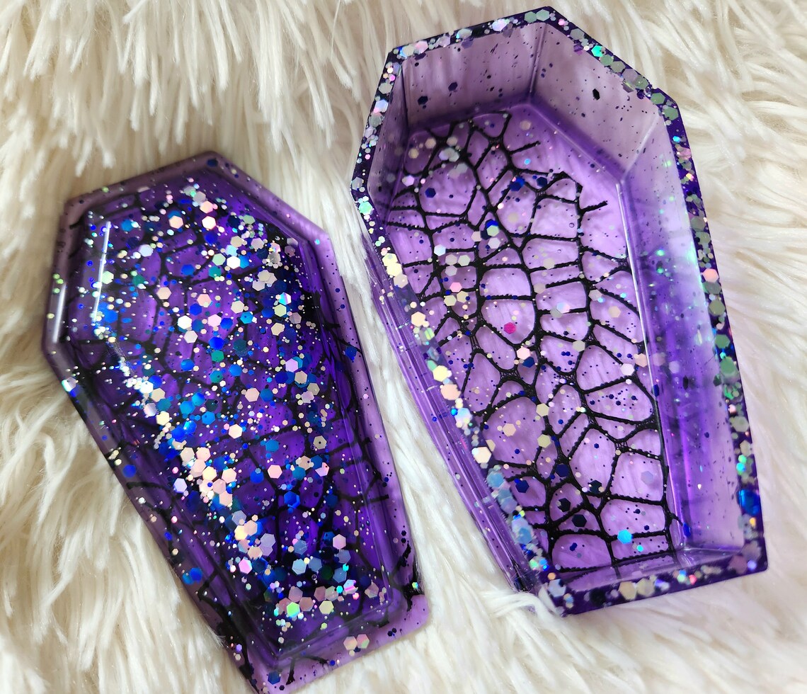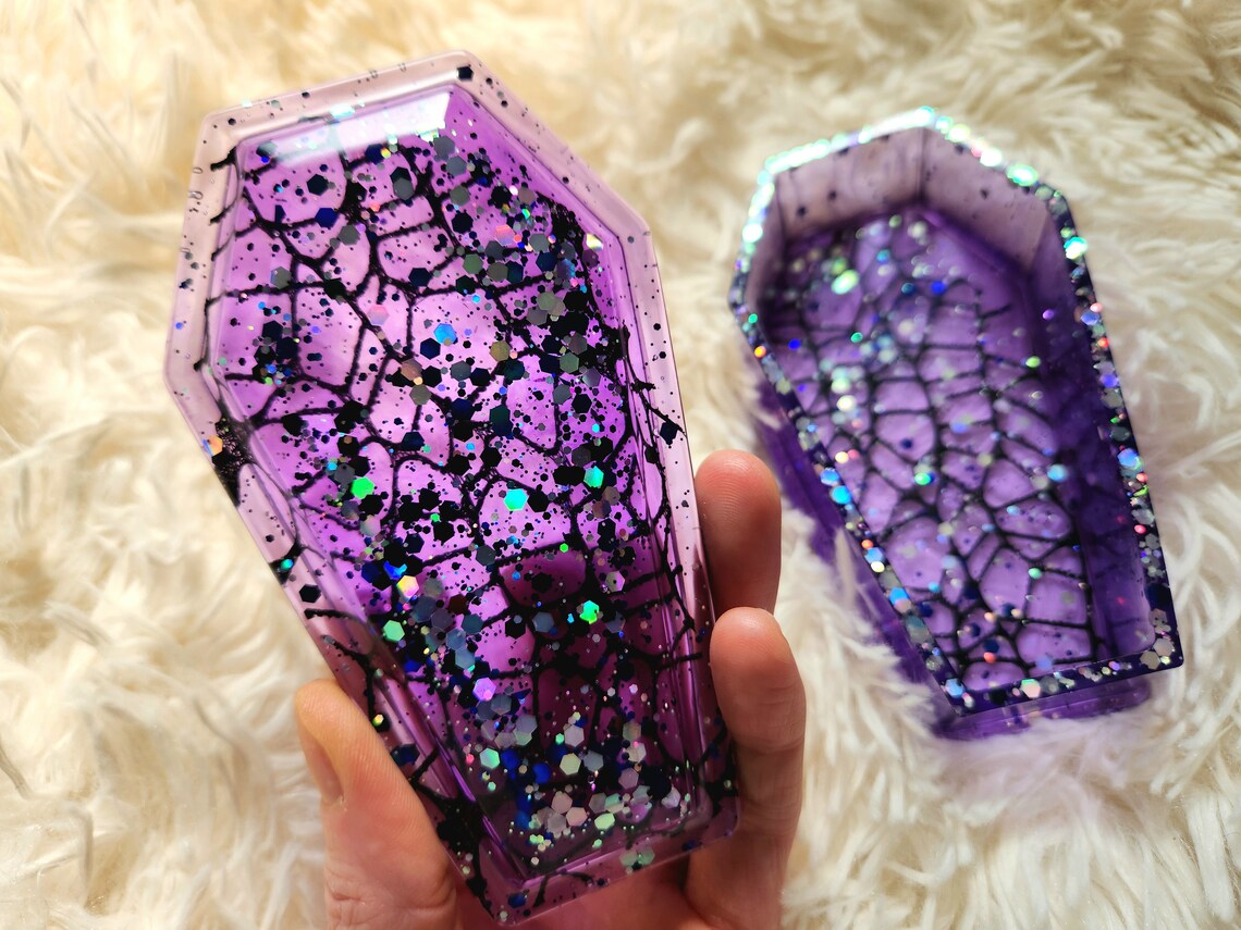 Our new spider web coffin stashbox is so elegantly gothic with a touch of sparkle. Handcrafted with epoxy resin and our own blend of dyes and glitters, this jewelry box is a perfect accent to your goth home decor. Makes a great storage container for jewelry, keys, herb,and more!