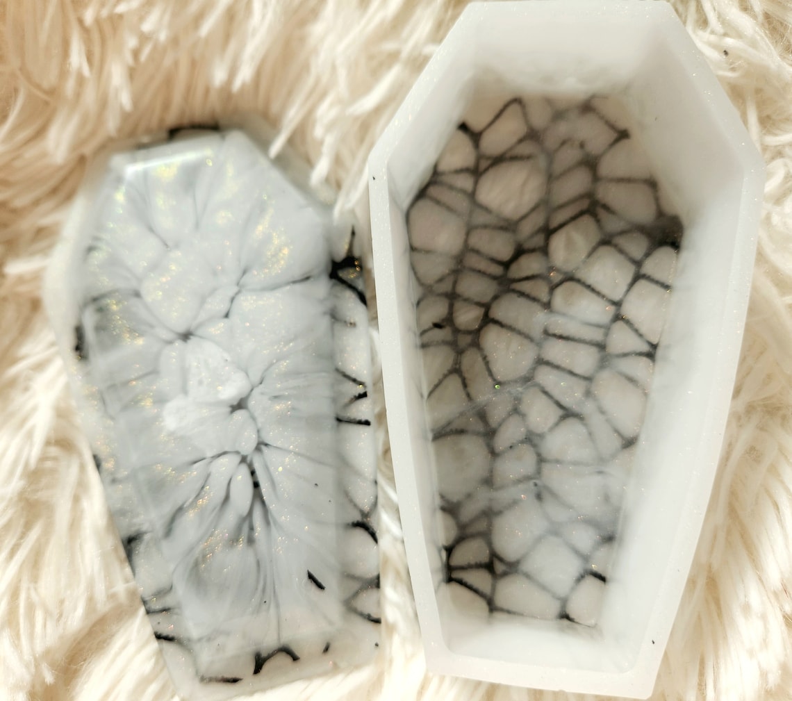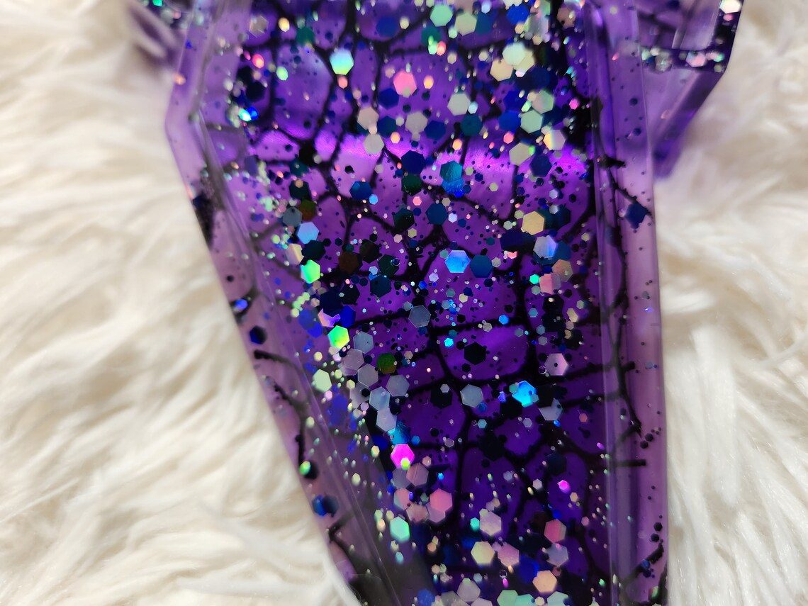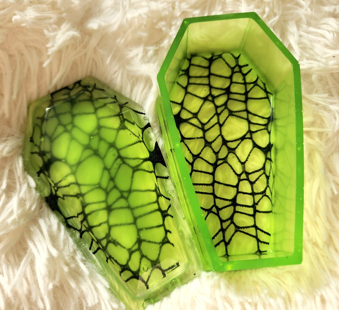 Our new spider web coffin stashbox is so elegantly gothic with a touch of sparkle. Handcrafted with epoxy resin and our own blend of dyes and glitters, this jewelry box is a perfect accent to your goth home decor. Makes a great storage container for jewelry, keys, herb,and more!