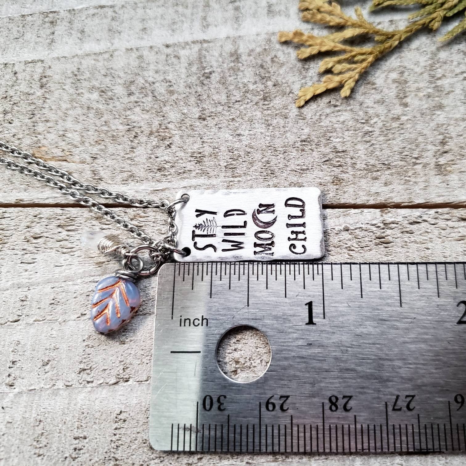 This sweet silver stay wild moon child necklace is perfect for moon lovers and wanderers alike. A Silver hand stamped bar has been given textured edges and suspended from a stainless steel chain and charms of natural rainbow moonstone and a Czech opalescent leaf.
