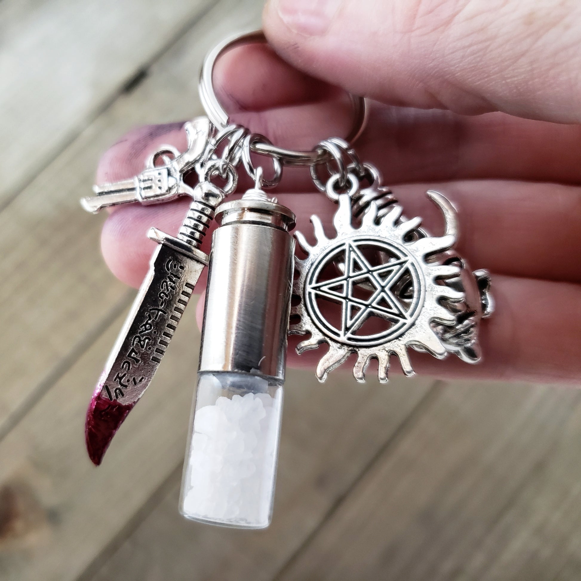 Hit the spooky backroads with this supernatural keychain! A lightweight stainless steel split key ring holds an assortment of charms meant to give you some protection from those supernatural apparitions lurking in the shadows.