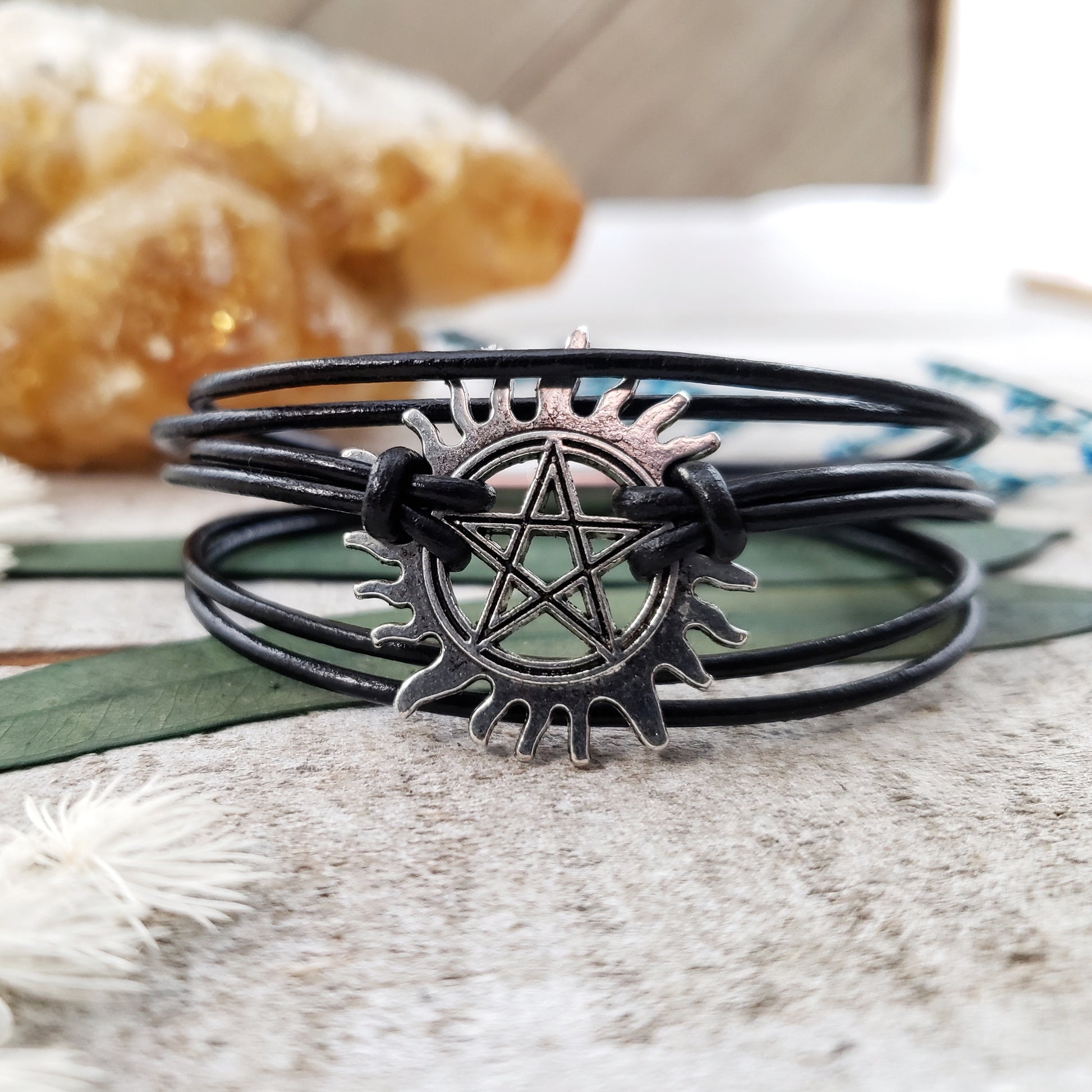 This supernatural leather bracelet has great unisex styling. Those that hunt together, stay together. Keep those evil spirits from inhabiting your body with these silver anti possession pentacle charm bracelets.
