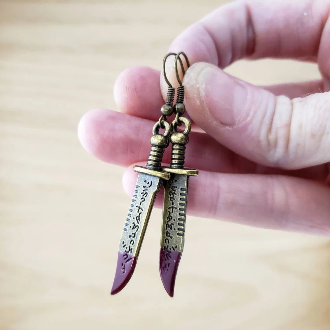 Every hunter protects themselves using any means necessary. These hand painted demon blade dagger earrings come on antiqued brass earring hooks with rubber ear nut backs.
